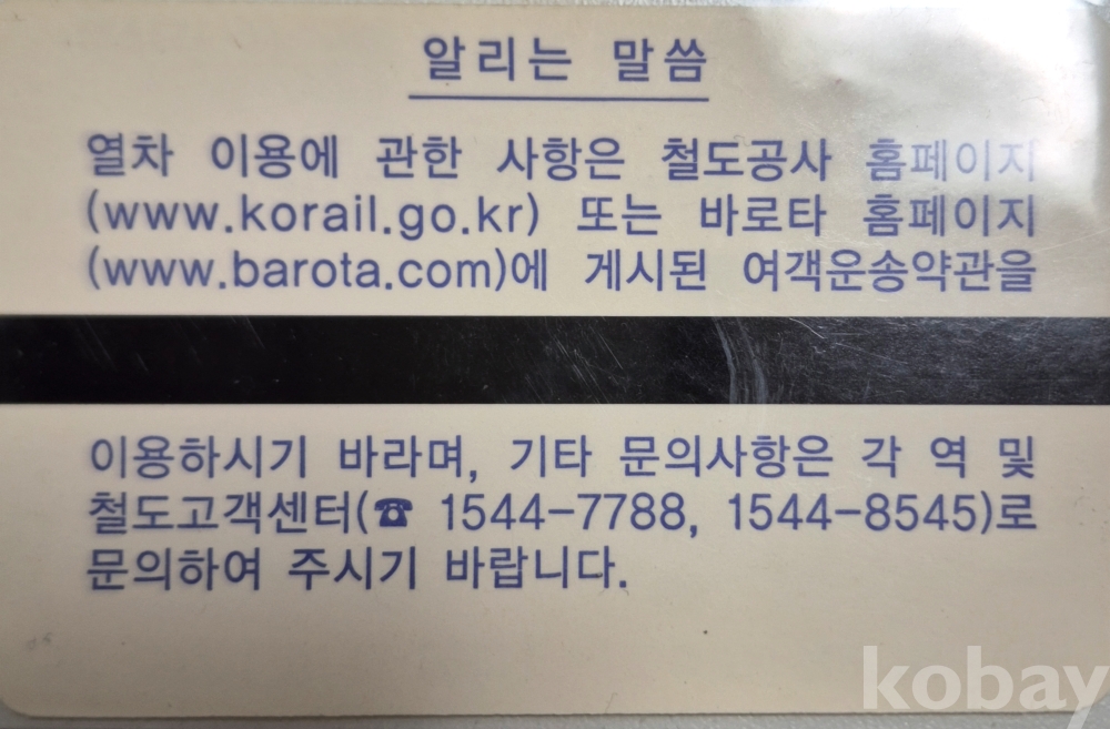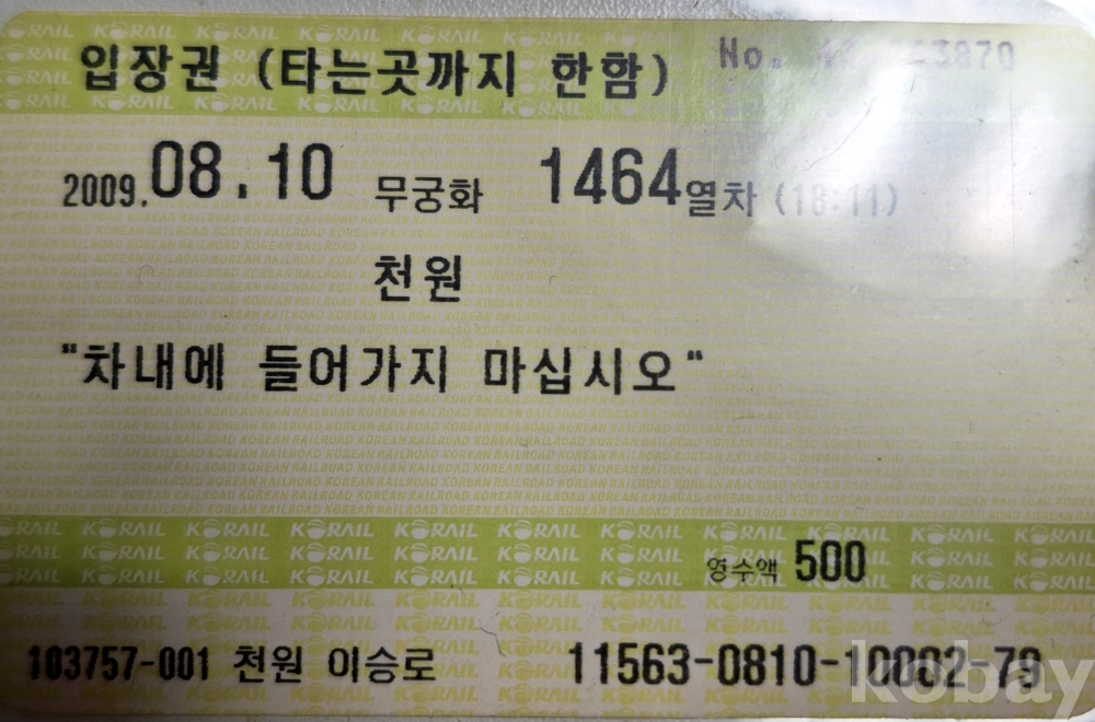 2009년 11월 30일 이전에 발행된 철도 MS(마그네틱) 단말기 천원역 입장권입니다.