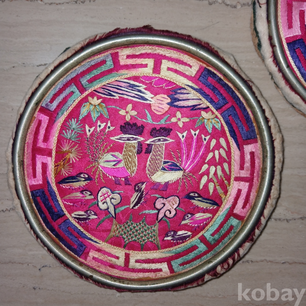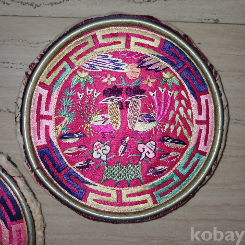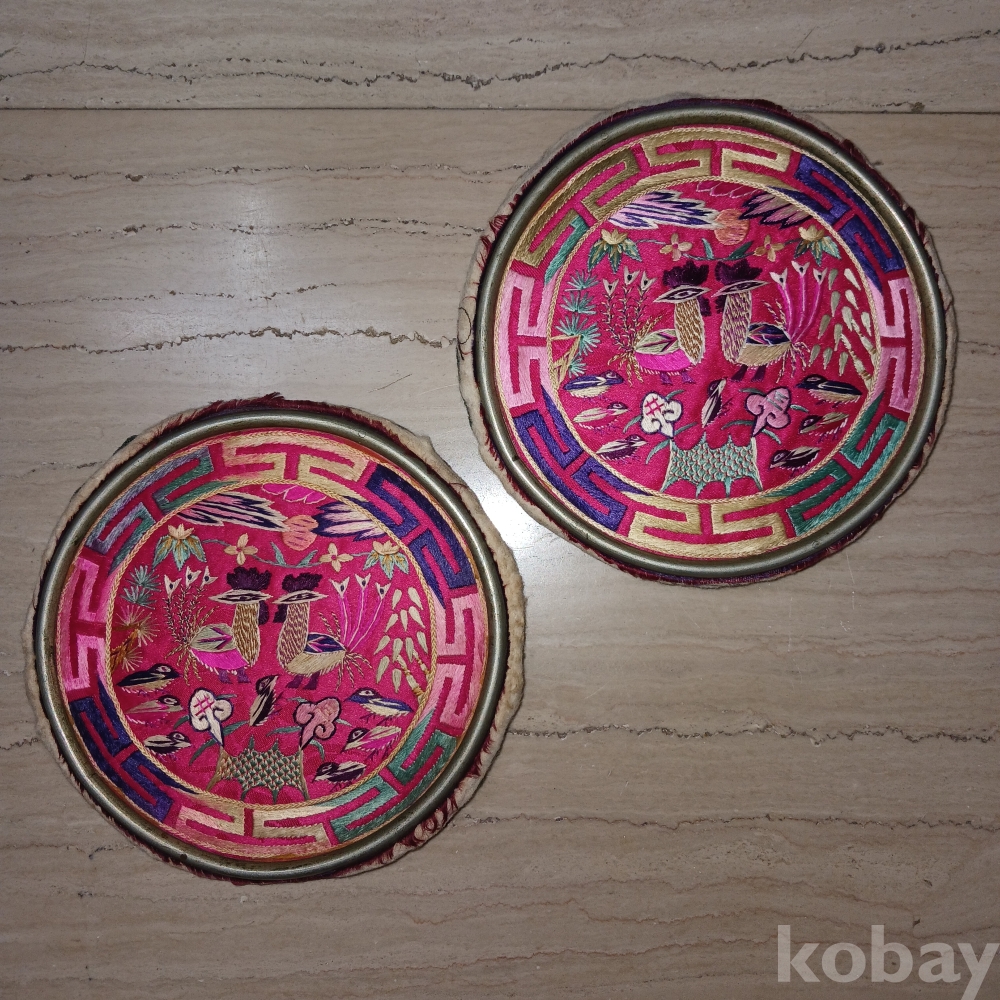 구봉침 춤무베갯모 입니다ㆍ 독특한 도안과 충무지역에서만 발견되는 유일한 백동테를 둘러 자수품을 보호하고 변형을 막으려는 백동테를 둘렀습니다 자수도 전문 수사들이 자수 했습니다 구하기 힘든 자료입니다.상태좋으며 뒷면에 소나무 판재가 있습니디ㅡㆍ 마지막사진 설명 보충으로 베갯모 책에서 인용된 설명입니다