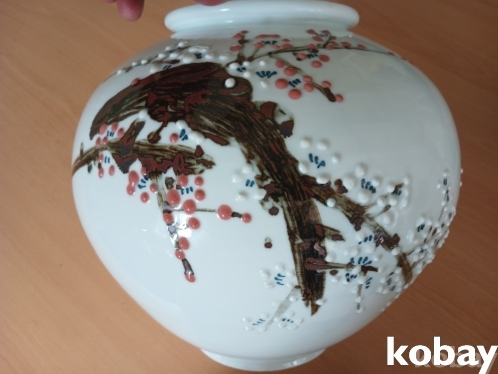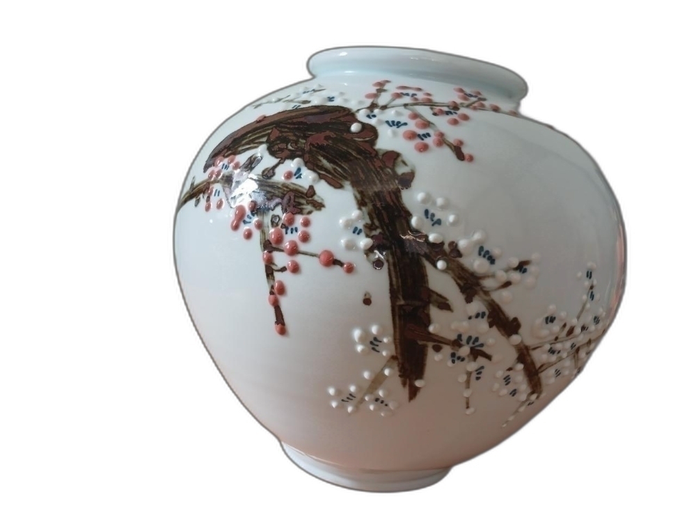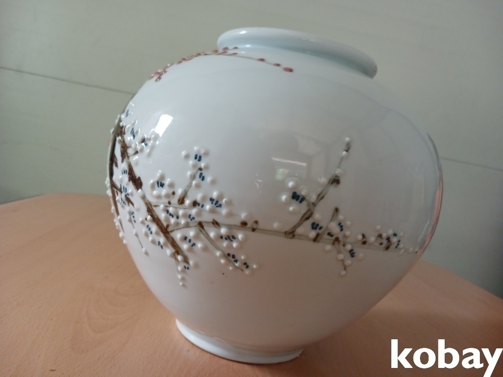 매화 꽃을 입체감 있게 표현한 달 도자기 입니다.