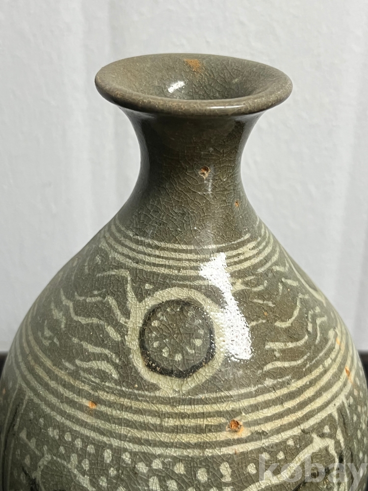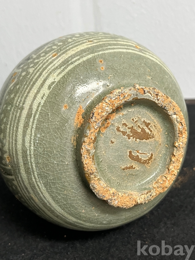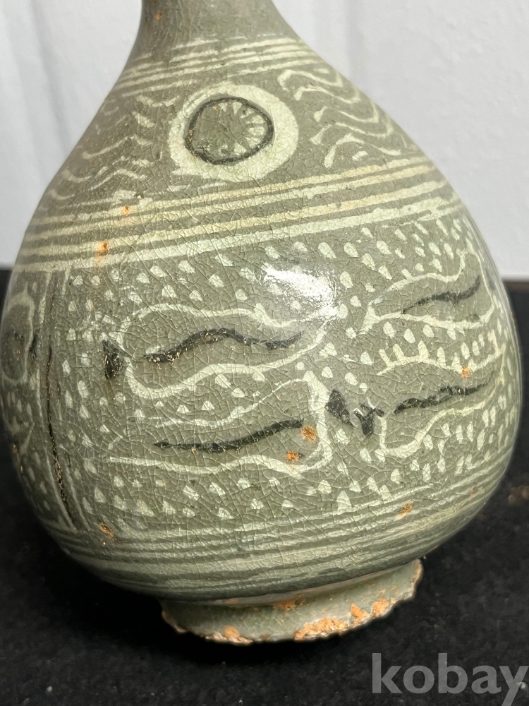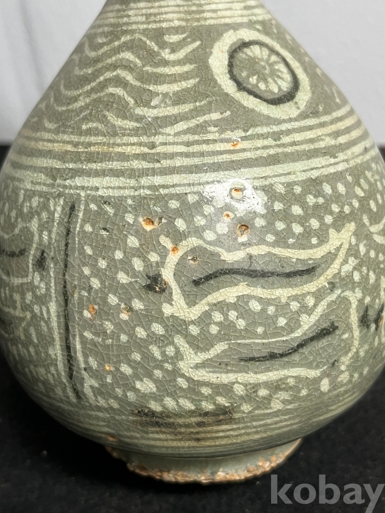담녹색의 유약위에 백토와 흑토를 상감하여 물결처럼 흐르는 유문을