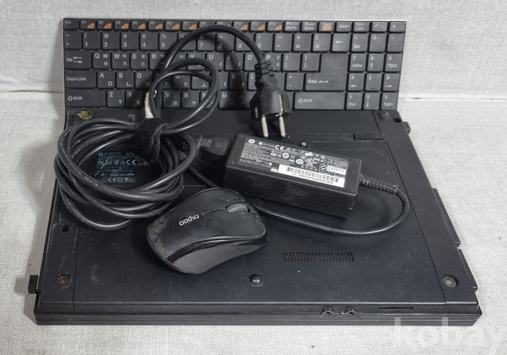노트북 본체, 충전 어댑터(전원 케이블), 무선 마우스(Rapoo), 무선 키보드(Rapoo)