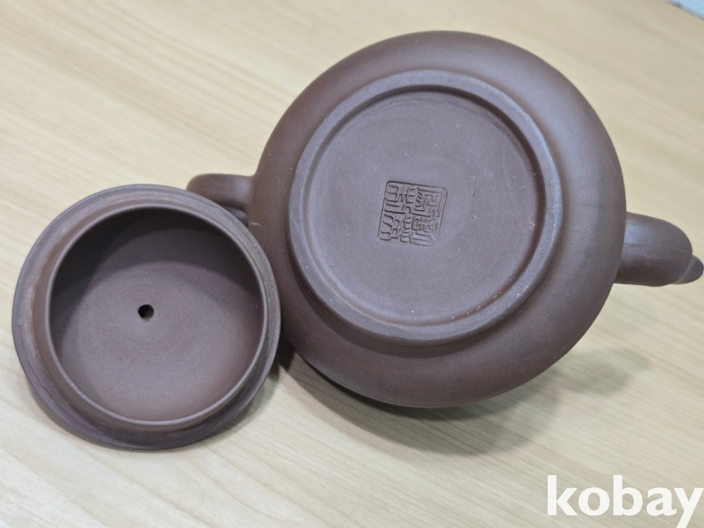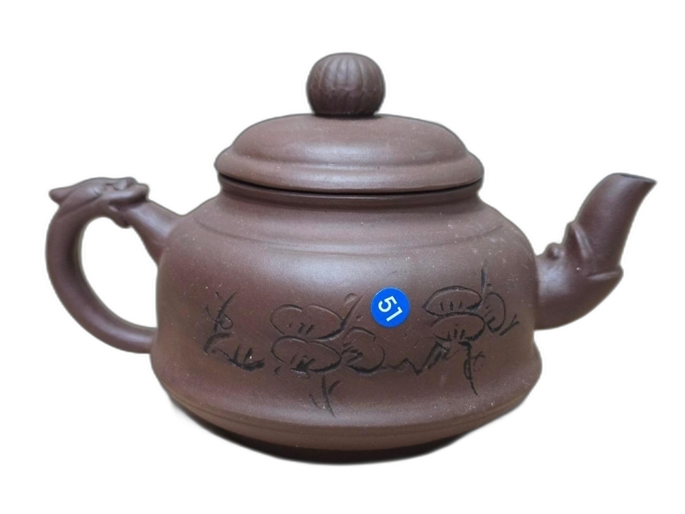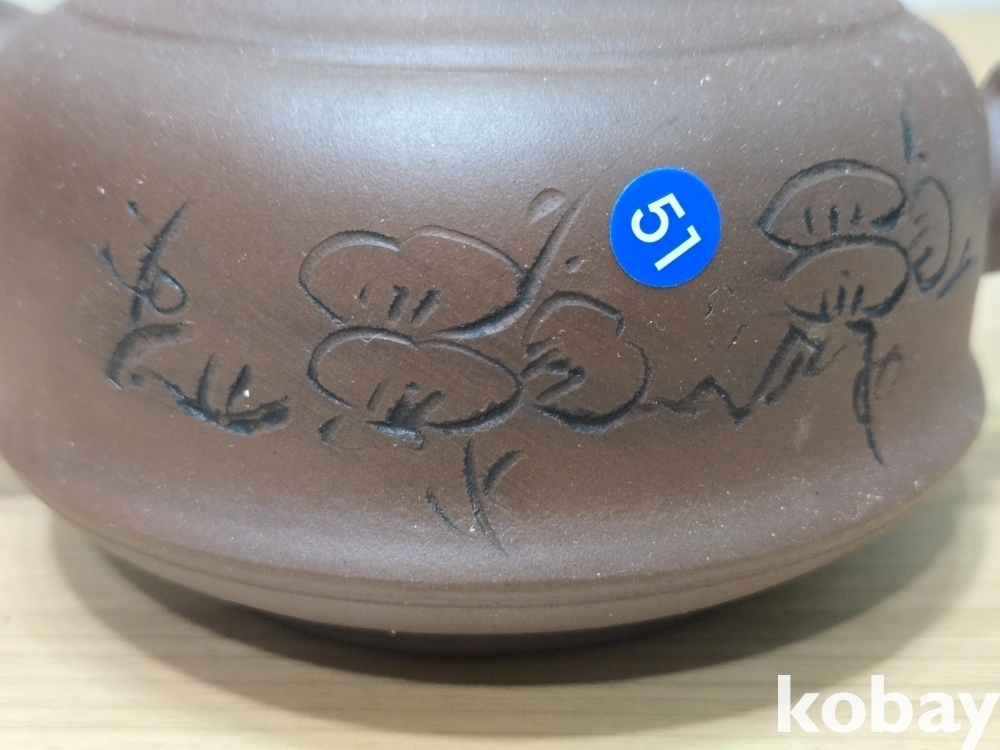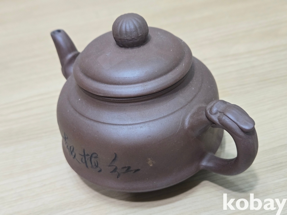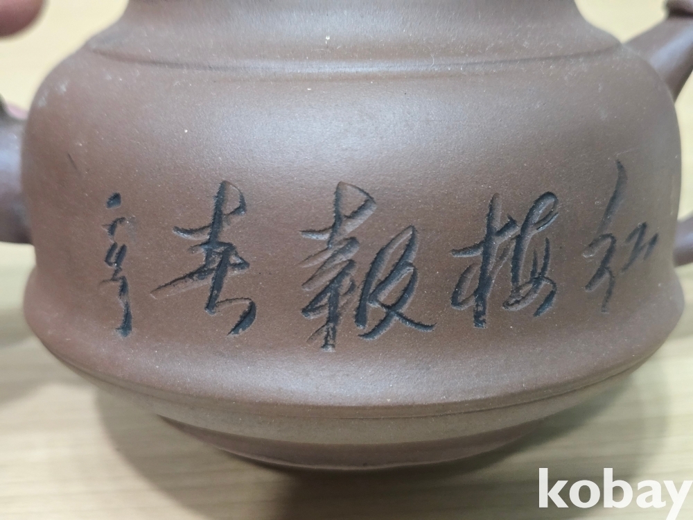 꽃 그림, 글씨가 음각으로 표현된 자사 주전자 도자기 입니다.