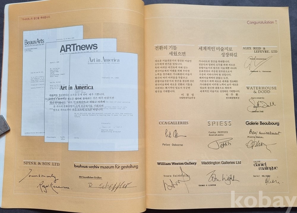 축전: 국립현대미술관장 이경성 등 당시 문화계 거물들의 창간 축사 수록.