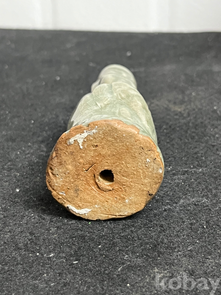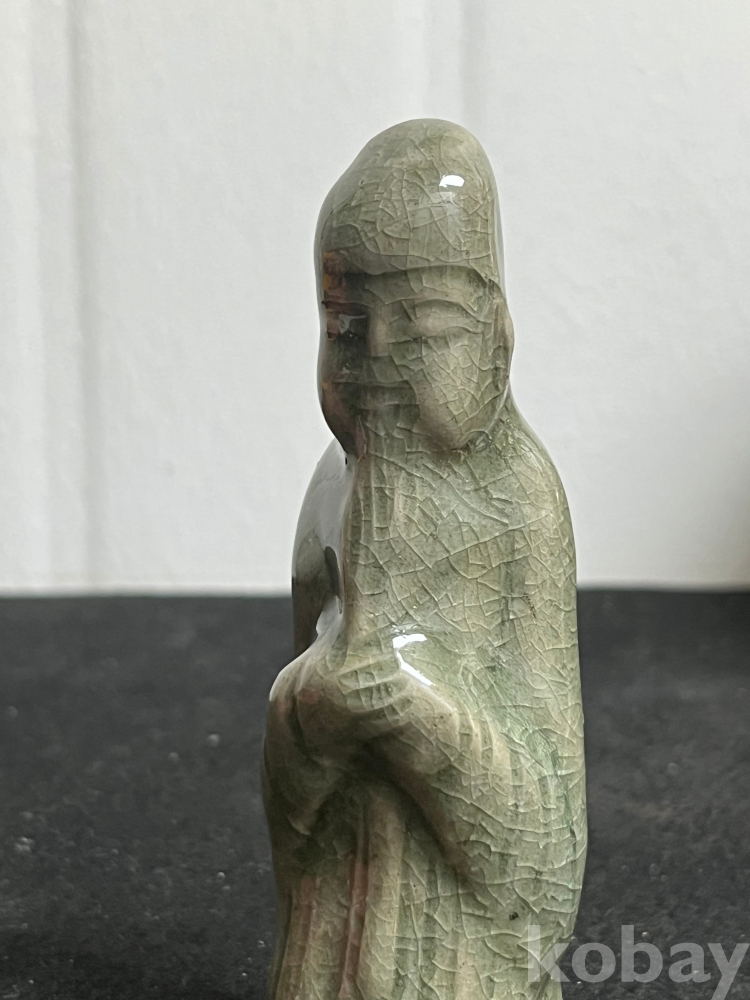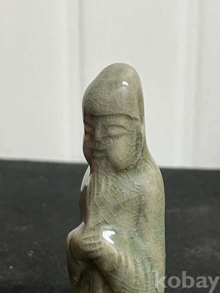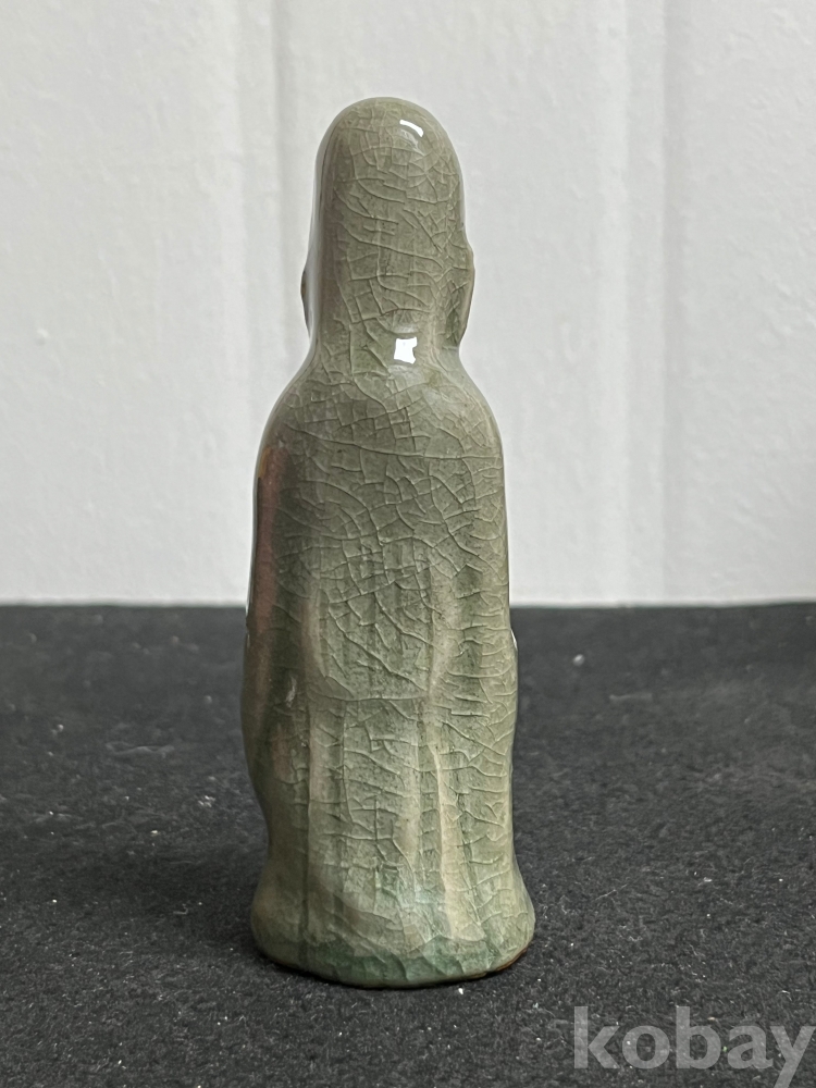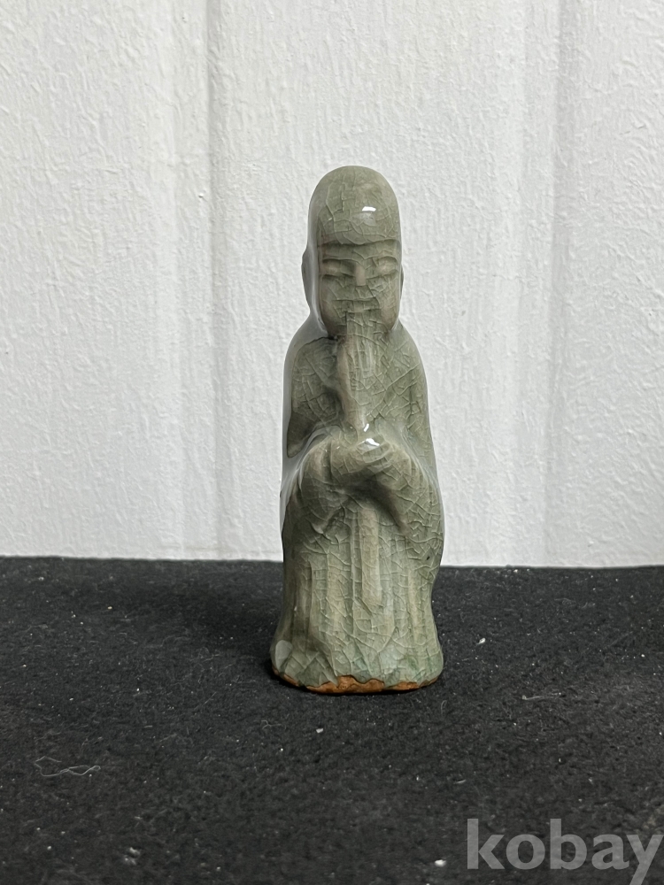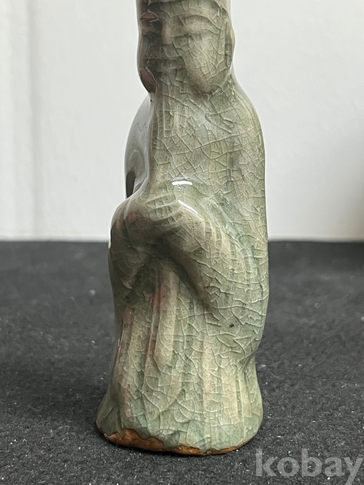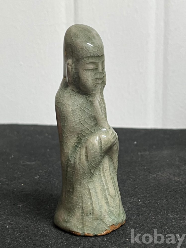 단정하게 서 있는 인물 형상을 조형적으로 풀어낸 상형청자입니다.
