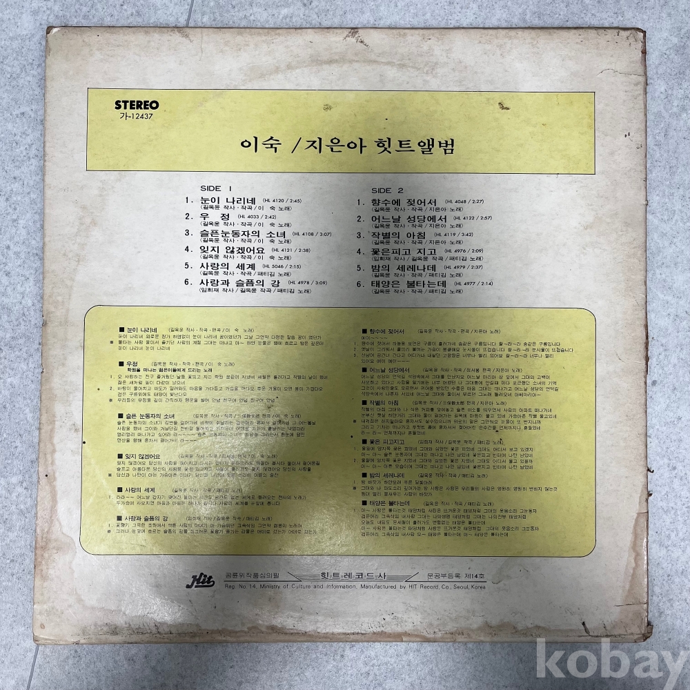 • 자켓: 1977년 발행된 오리지널 자켓입니다. 세월에 따른 변색은 있으나, 전면의 이숙 씨 사진 상태는 훼손 없이 선명하여 수집 및 전시용으로 훌륭합니다.