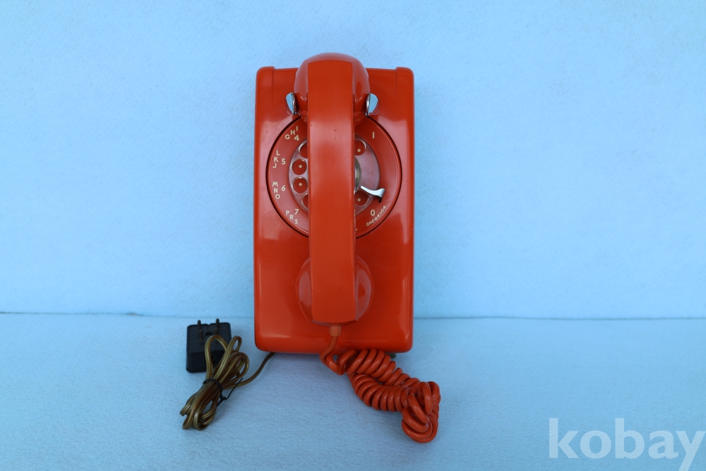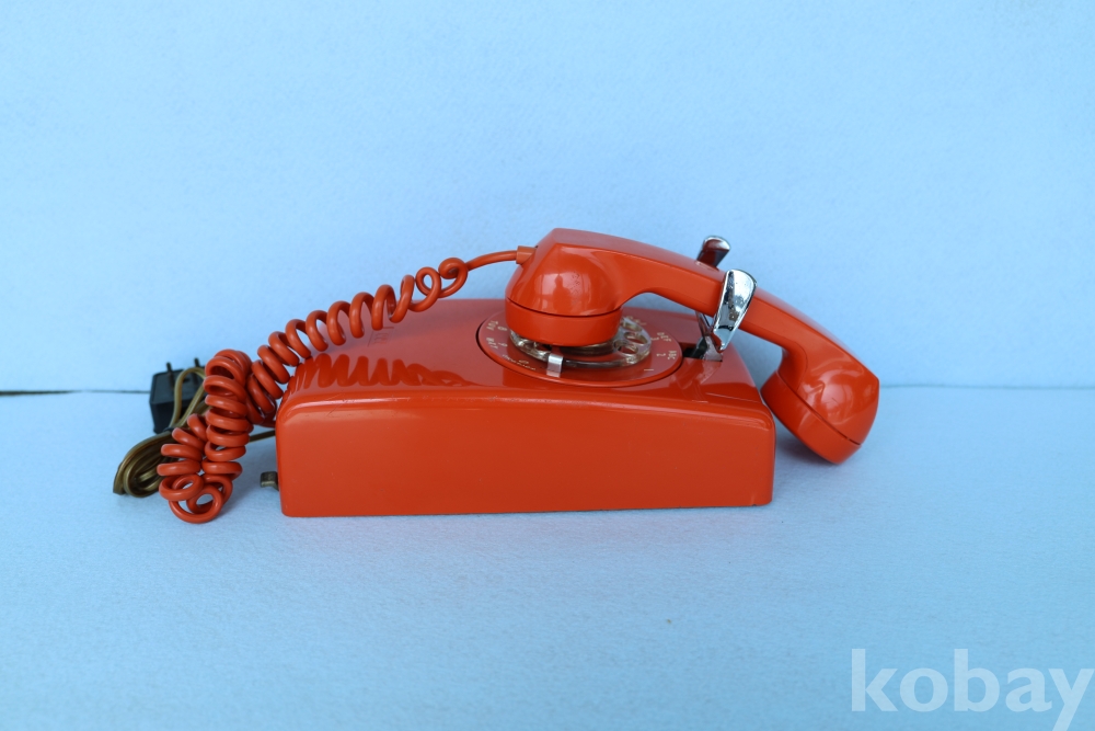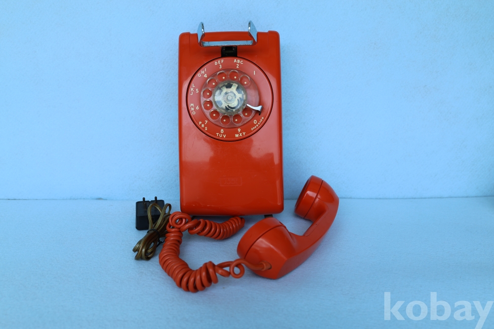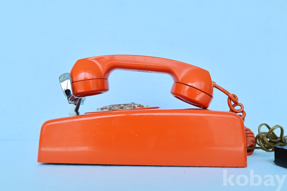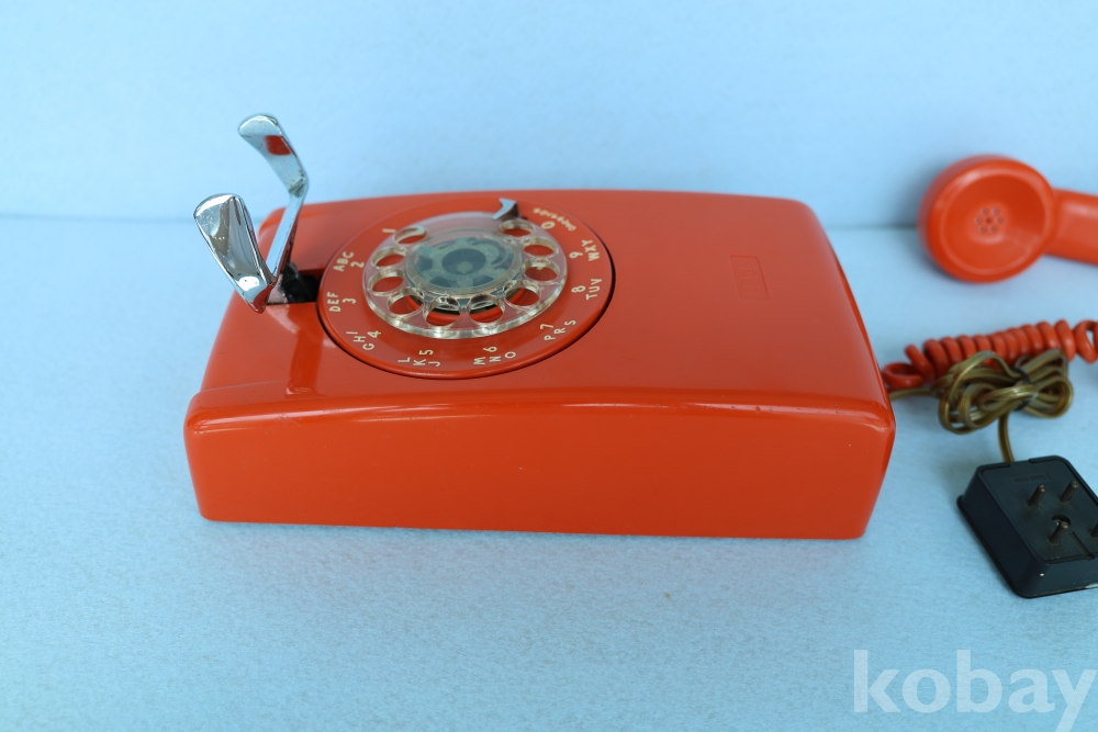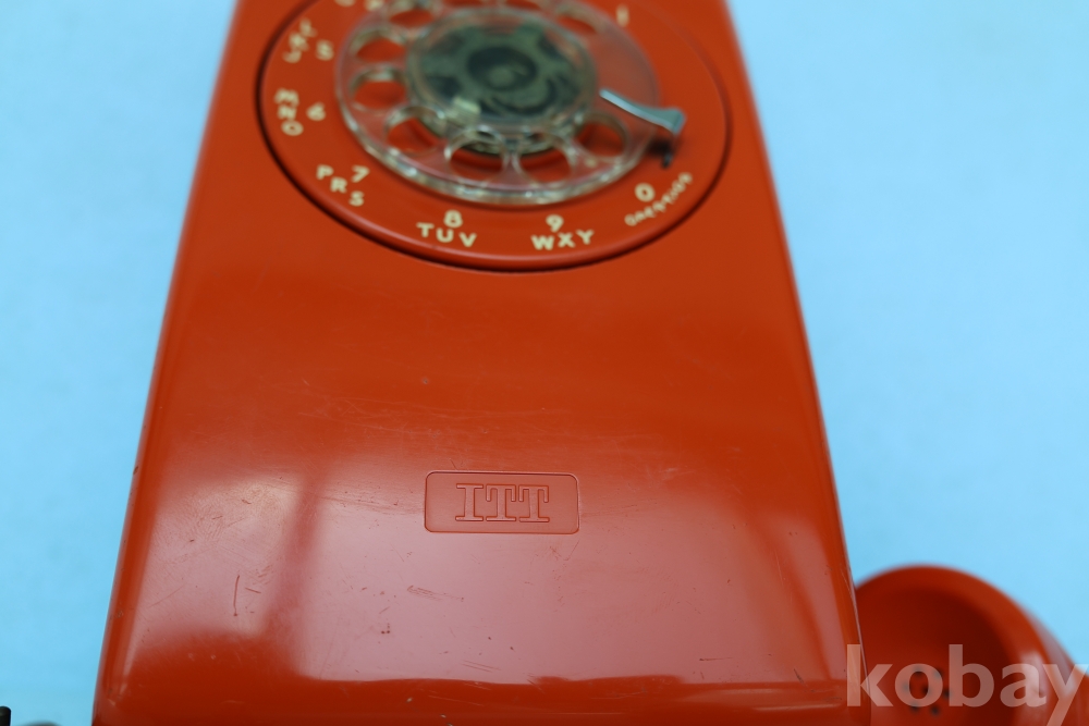 선명한 주황색 바디와 세로형 벽걸이 실루엣이 눈에 들어오는 ITT 다이얼 전화기입니다.