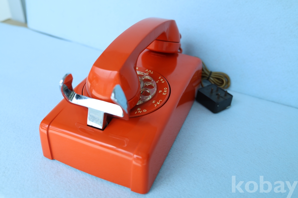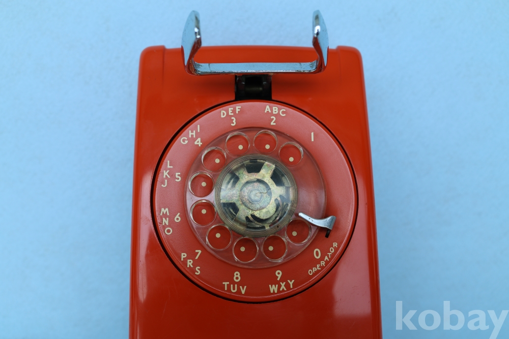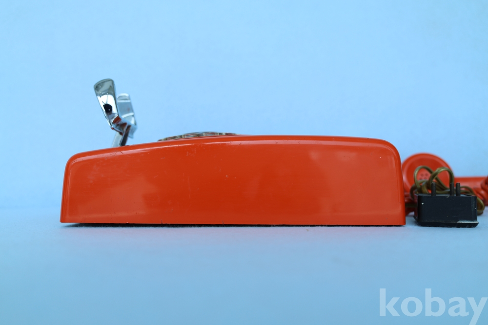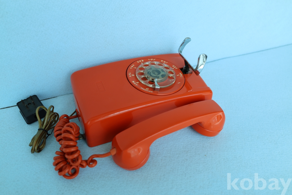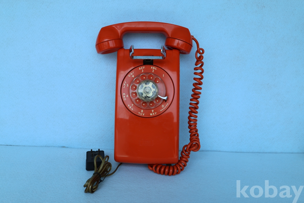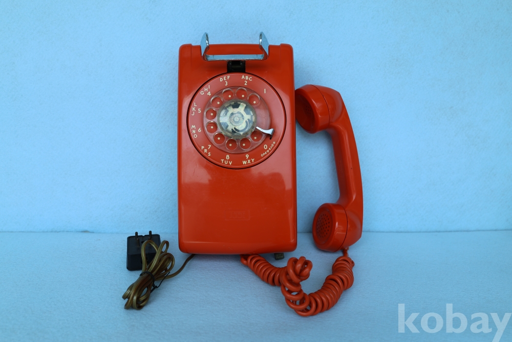 선명한 주황색 바디와 세로형 벽걸이 실루엣이 눈에 들어오는 ITT 다이얼 전화기입니다.