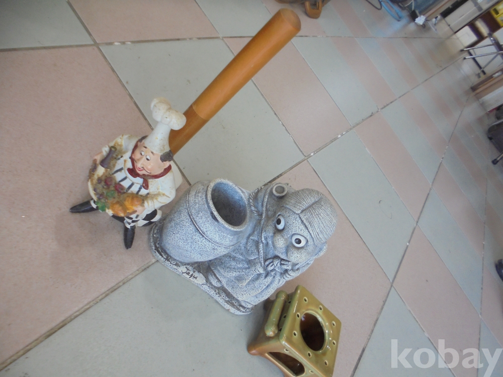 제주도 할멈이 물둠벙걸빵에서 독에 물붓는 전통 토속적 마불류 큰모형과 서구써비스 빵모자쓴 요리사가 술빵과일등을들고 있는뒤나무대와깨진데있는