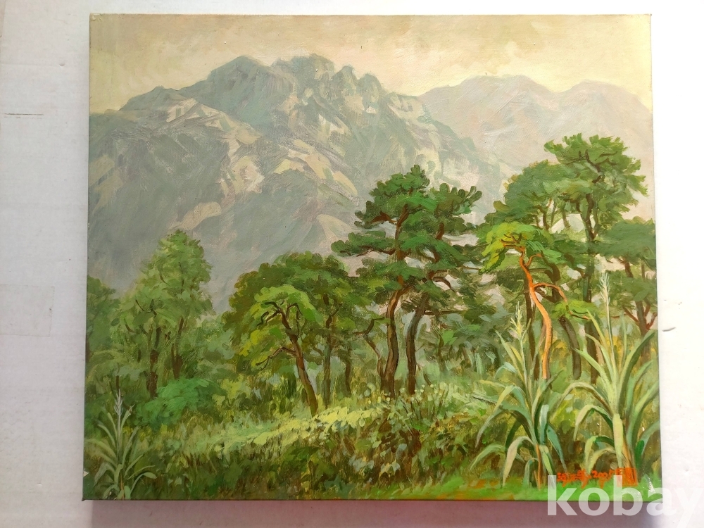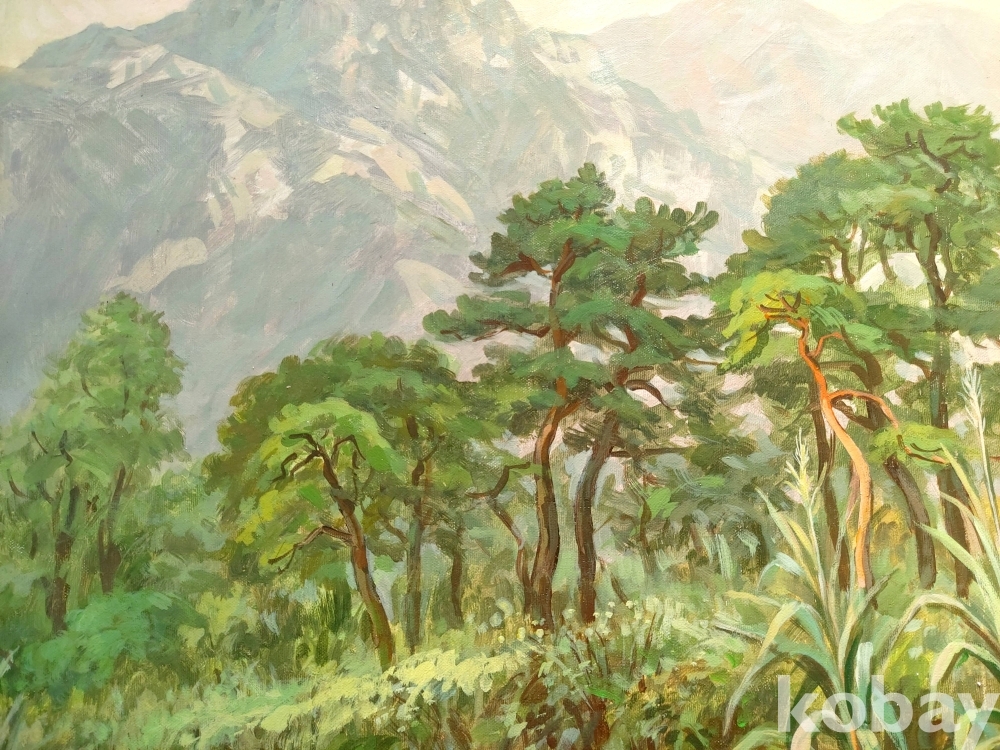 작품 설명: 전경에는 수목과 풀숲이 밀도 있게 배치돼 있으며, 중경에는 굴곡 있는 소나무가 반복적으로 등장한다. 후경에는 산세가 겹겹이 이어지며 명암 대비로 깊이감을 형성하고 있다. 녹색과 갈색 계열이 중심을 이루며 자연 풍경의 흐름과 층위가 안정적으로 구성돼 있다. 현대 사생회 출품작이다.