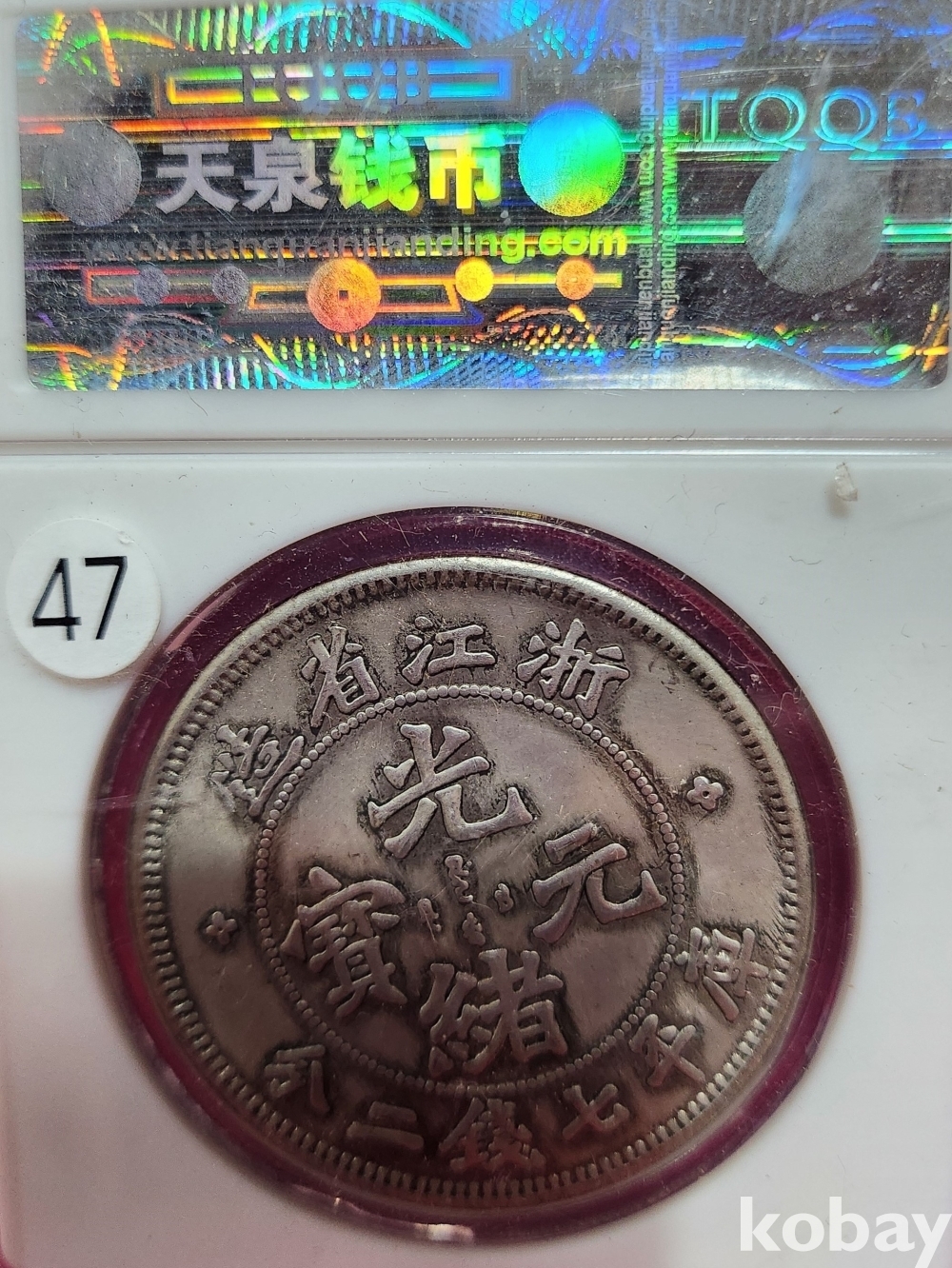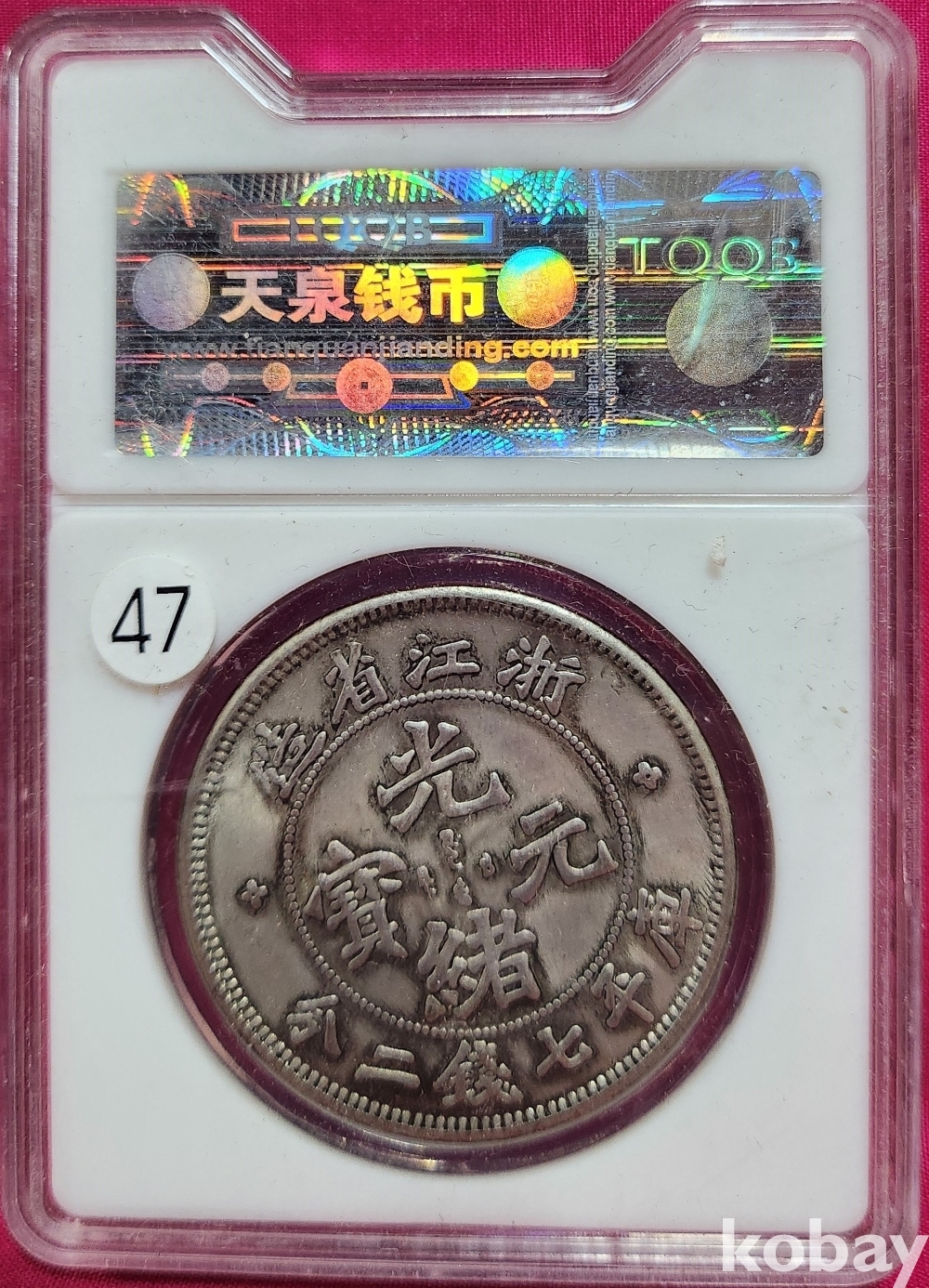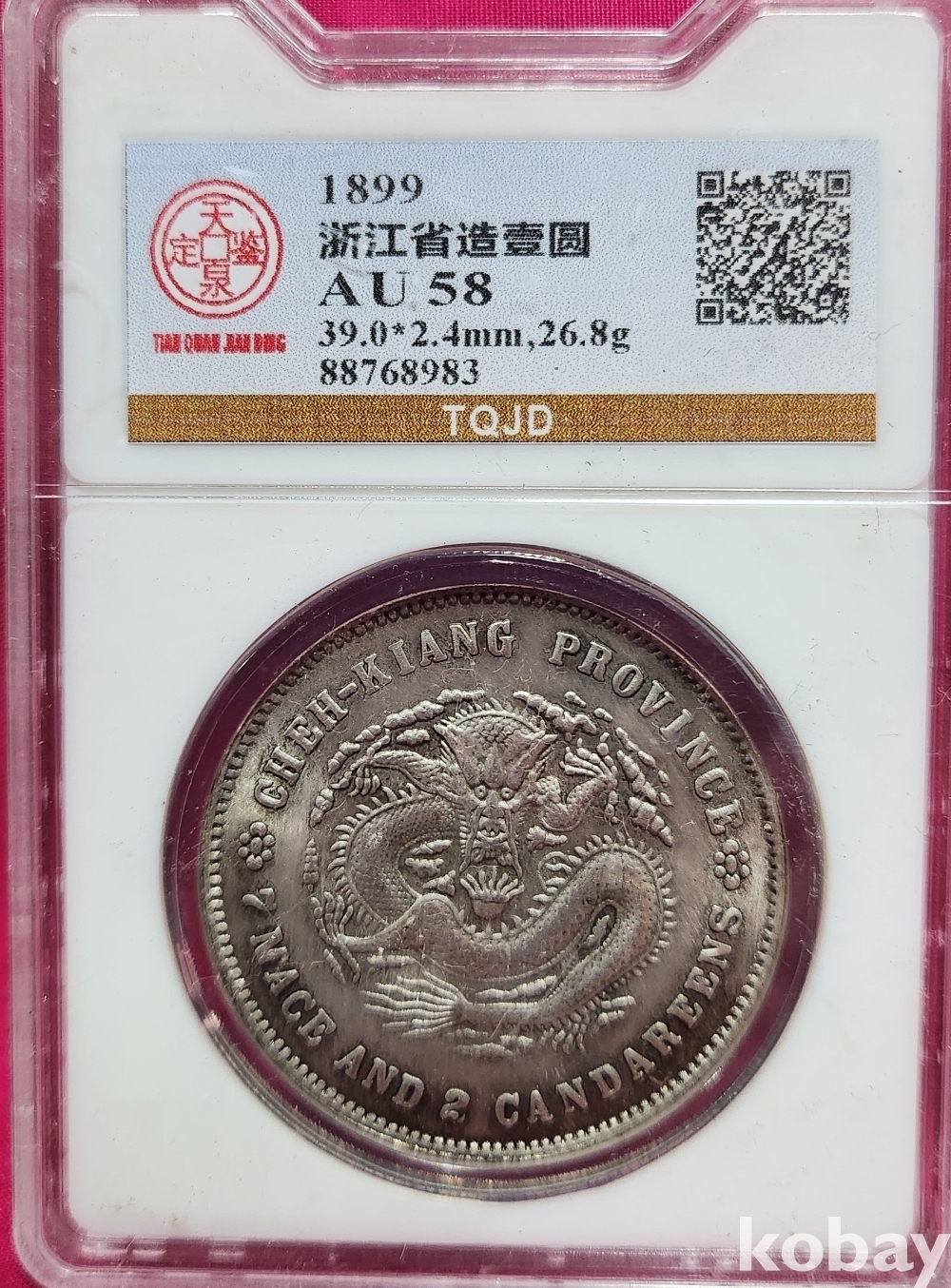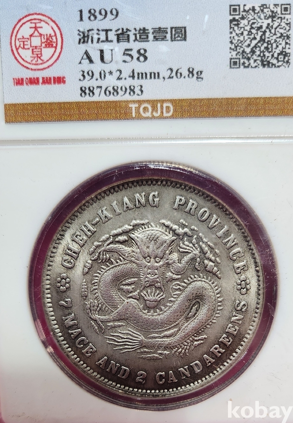 1899년 큐알코드(QR CODE)가 함께하는 은색 광서원보 (光緒元寶) 화패로 밀봉된 상태입니다,