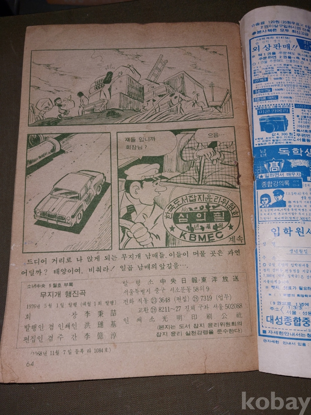 (만화) 무지개행진곡 - 소년중앙 1976년 5월호 부록/ 세월의 흔적이 있으나 낙장 낙서는 없는 완전본임