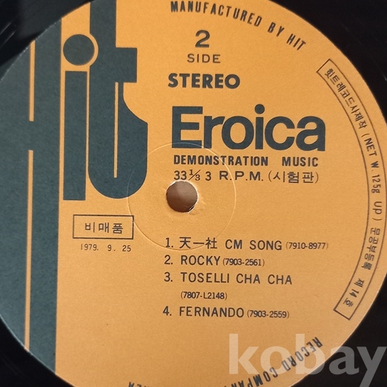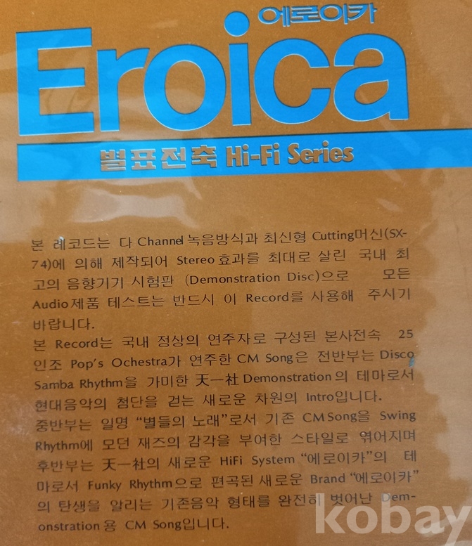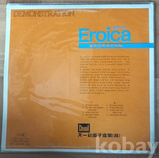 오랫동안 소장해온 데몬스트레이션 앨범 몇장을 골라서 올리고 있읍니다. 음향기기와 레코드 회사 등이 제작한 홍보, 사은, 증정. 비매품 앨피반입니다. 따로 수집해 봐도 좋을것 같읍니다. 이 음반은 당시 유명했던 전축제조사인 천일 에로이카에서 씨리즈로 제작한 데모반입니다. 상태는 사진을 아주 여러장 올렸으니 자세히 봐 주시고.. 직접 틀어보지 않았읍니다만 대체로 좋아보입니다. 상당한 기간 공들여 수집했던겁니다. 아시겠지만 한번에 만나기는 어려운 음반들입니다.