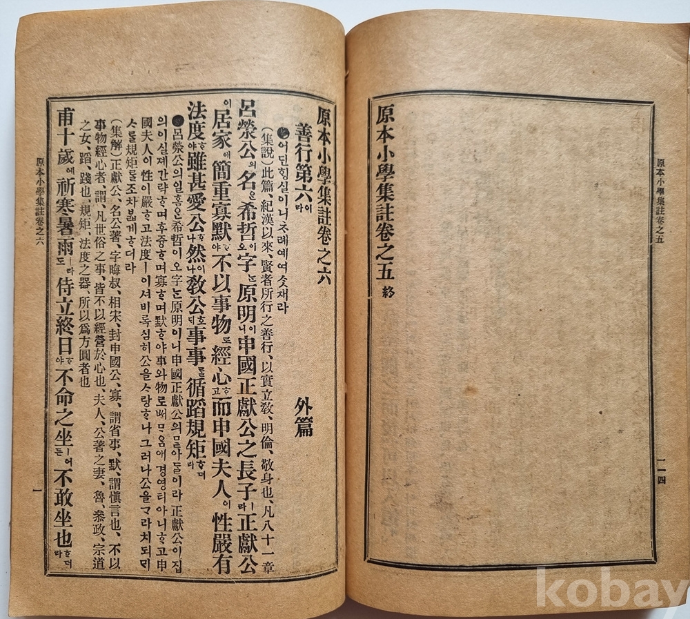 구성 및 내용권수: 총 6권 중 **제5권(외편 가언)**과 제6권(외편 선행) 및 **소학발(小學跋 - 발문)**이 수록된 '하권'입니다.