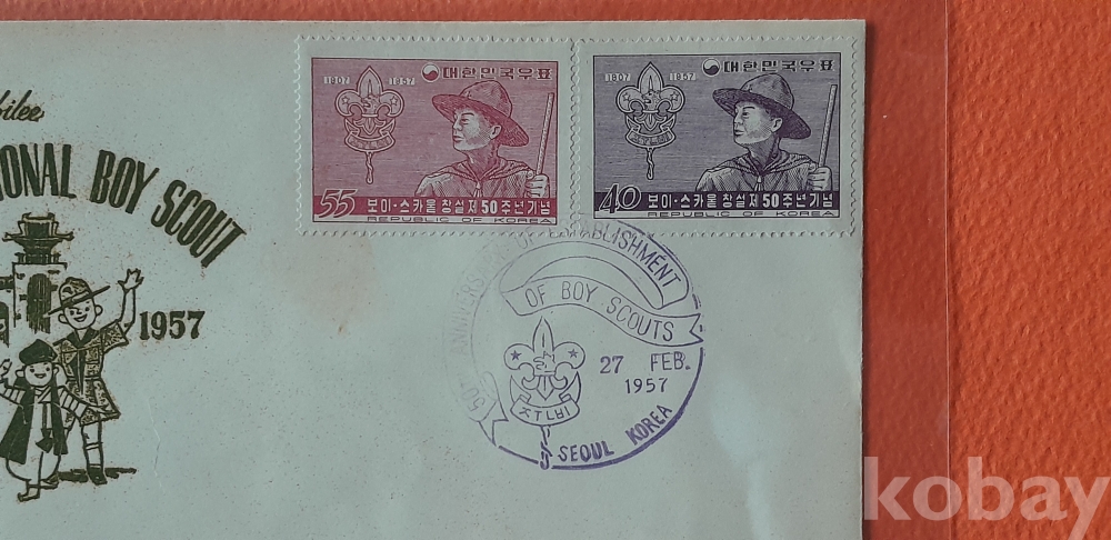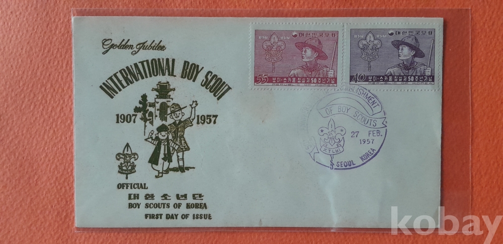 1957년 발행 보이스카우트 창설 50주년 기념 2매 첩부 초일봉피 입니다.