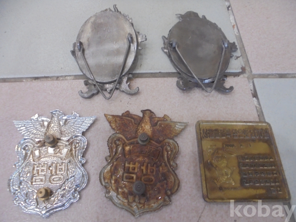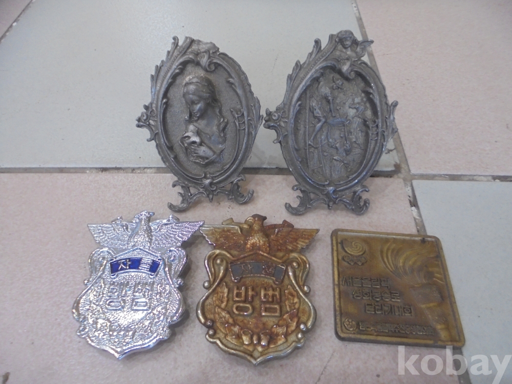유기로입체적인 서울88올림픽 성화봉송로 달리기대회 유기메달 1점과 방법대원이 앞에차는 자율방범대원표찰2점과 주석으로만든 성모마리아상