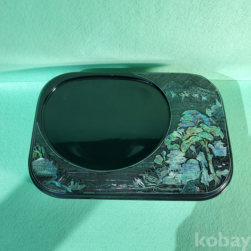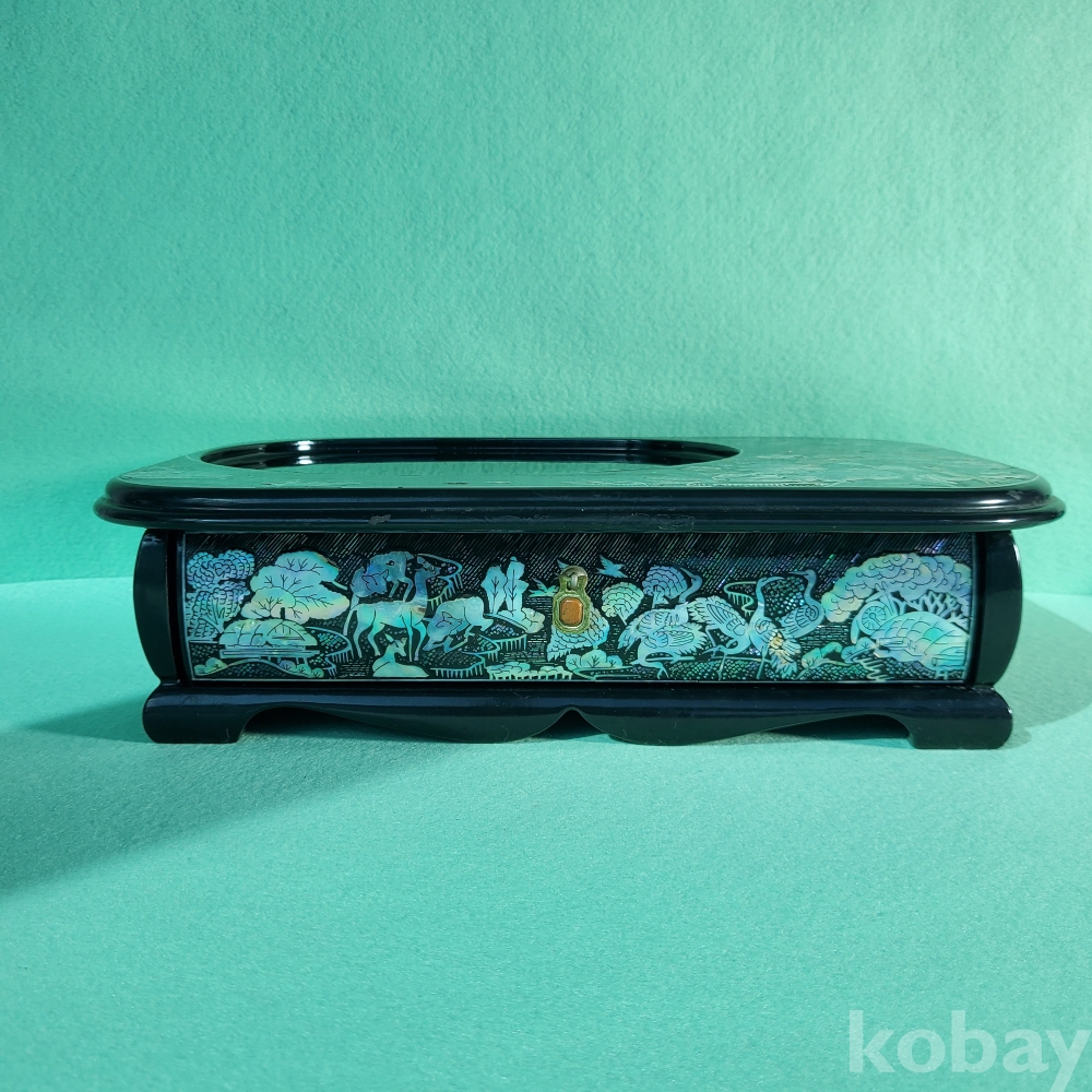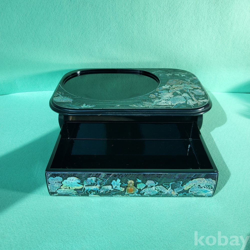 이 제품의 가장 큰 특징이자 압도적인 매력은 바로 칠흑같이 어두운 본체 위에 수놓아진 화려한 영롱함에 있습니다. 한국 고유의 전통 공예인 나전칠기 기법을 차용하여, 학과 꽃 등 자연의 풍경을 섬세한 자개 무늬로 수놓은 매우 희귀한 물건입니다. 차가운 전자기기에 전통의 숨결을 불어넣어 마치 안방마님의 귀한 자개함을 보는 듯한 우아함을 자아냅니다. 또한, 제품 아래의 서랍이 있어서 간단한 전화번호부나 메모지 등 같이 물건을 보관하는 것도 가능한 실용적이고 세심한 설계가 돋보입니다.