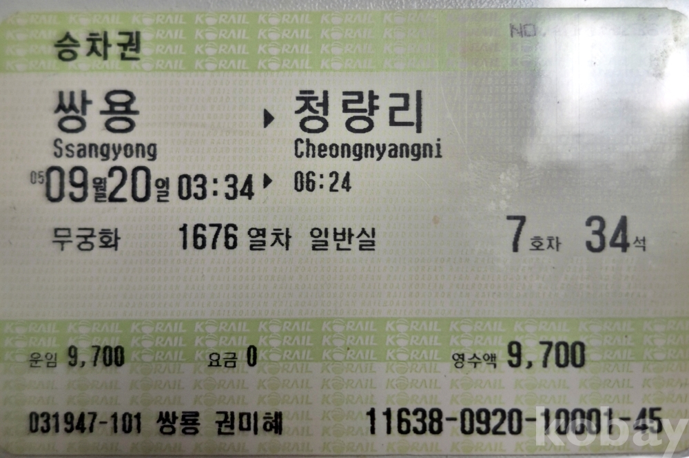 2009년 11월 30일 이전에 발행된 철도 MS(마그네틱) 단말기 쌍룡-청량리 승차권입니다.