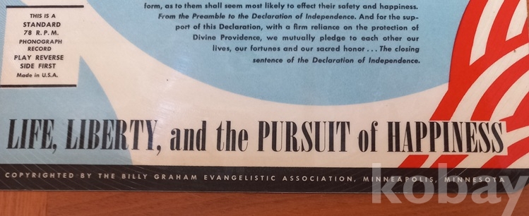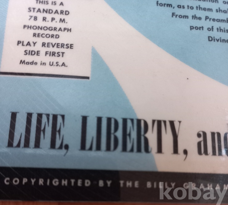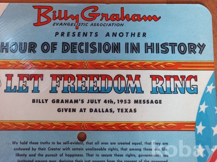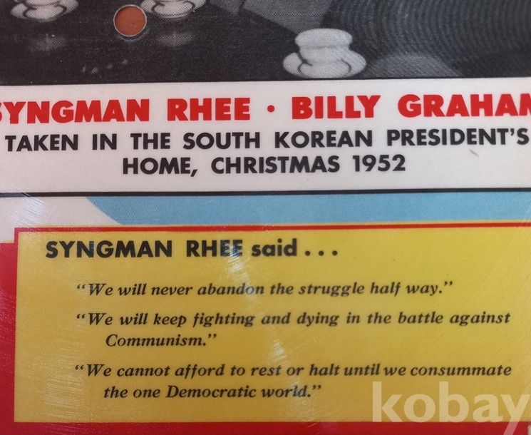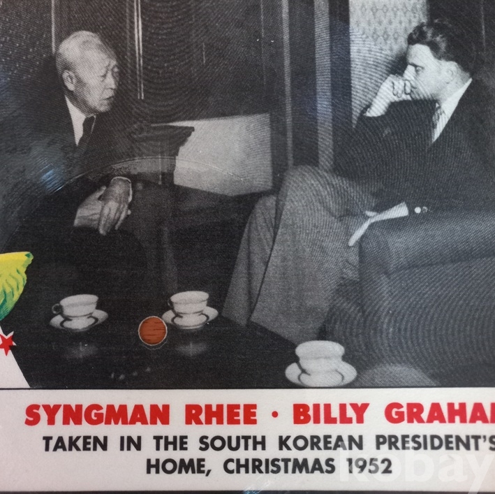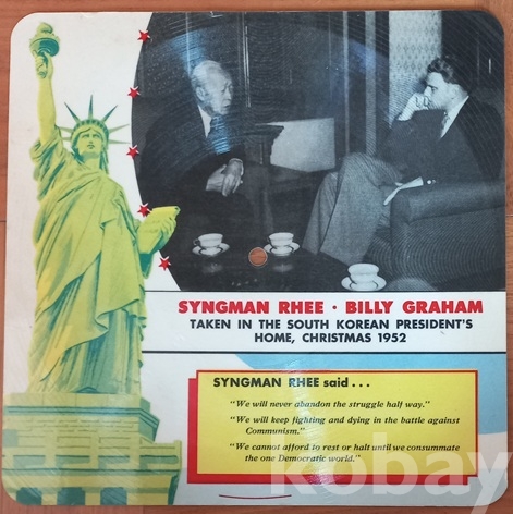 빌리 그레함 목사(1911?~ 2018), 한국전쟁 당시인 1952년 한국을 방문해 미군들을 위로하고 서울과 부산 등지에서 각종 집회를 통해 한국교회 지도자들을 만났고 성탄절에는 경무대에서 이 대통령을 만나 전쟁중에 있던 한국에 자유와 평화의 지원과 한국교회가 공산화를 막는데 기여하는 멧세지를 수록하였습니다. 그의 설교가 담긴“Let Freedom Ring(자유가 울리게 하라)”를 뒷면에 넣어 53년에 발매하였다 합니다. 참 빌리 그레함 목사는 그후 56년에도 그리고 74년도엔가 몇차례 방한한적이 있고 당시 음반도 나왔었다 하네요. 하긴 찿아보면 내게도 한두장은 있지 싶고.