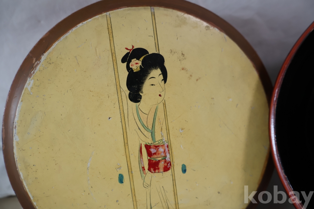 멋진 게이샤 의 모습 안쪽으로 앙증 맞은 상자? 등이 보이는 나무 옷칠 상자 임니다 세월의 흔적이 보임니다 .극히 귀한 공예품 임니다 사진 참조 하세요
