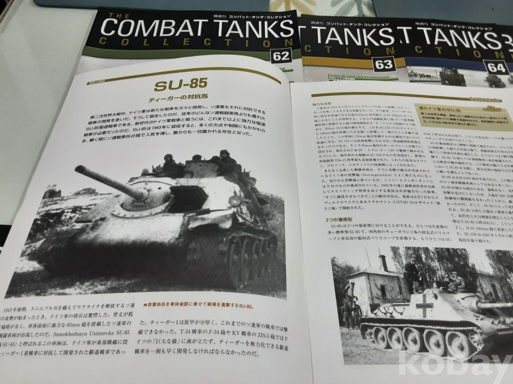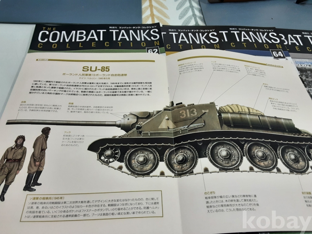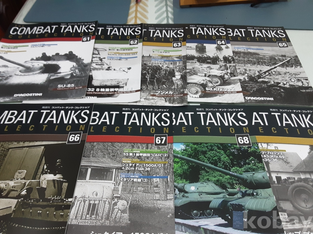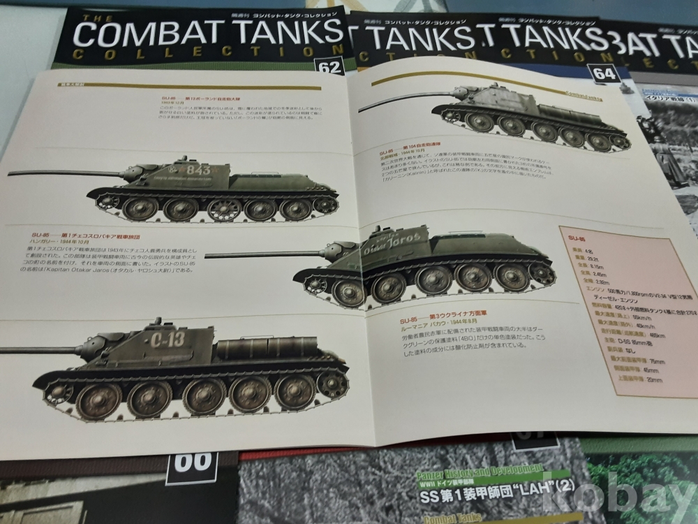 1. 데오고스티니(DeAGOSTINI) 전투 탱크 컬렉션은 다양한 국가의 제2차 세계 대전 및 냉전 시대를 대표하는 탱크들을 정교하게 재현한 1:72 스케일의 모형 120종 시리즈로 각 모델에는 디스플레이 케이스, 탱크모형과 잡지가 함께 제공된다. 전세계적으로 수집가들에게 인기가 많은 데오고스티니(DeAGOSTINI) 탱크 모델 해설서인 잡지 전 120종 판매. 61. Su-85 자주포 62. Sd. Kfz 232 중장갑 정찰 63. 흄멜 64. Sd. Kfz 222 65. 8,8cm Flak 37 66. 6호전차 타이거 E형 67. Steyr 1500A 68. 스탈린 중전차 3m 69. Kfz.69 +Pak 35 70. 프랑스 AMX 30B2
