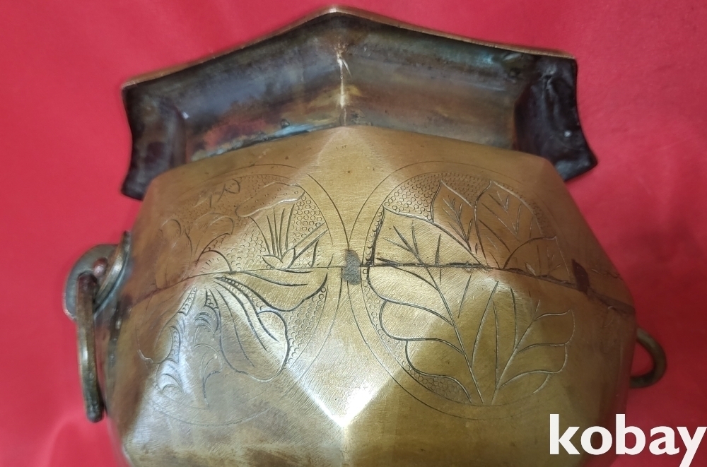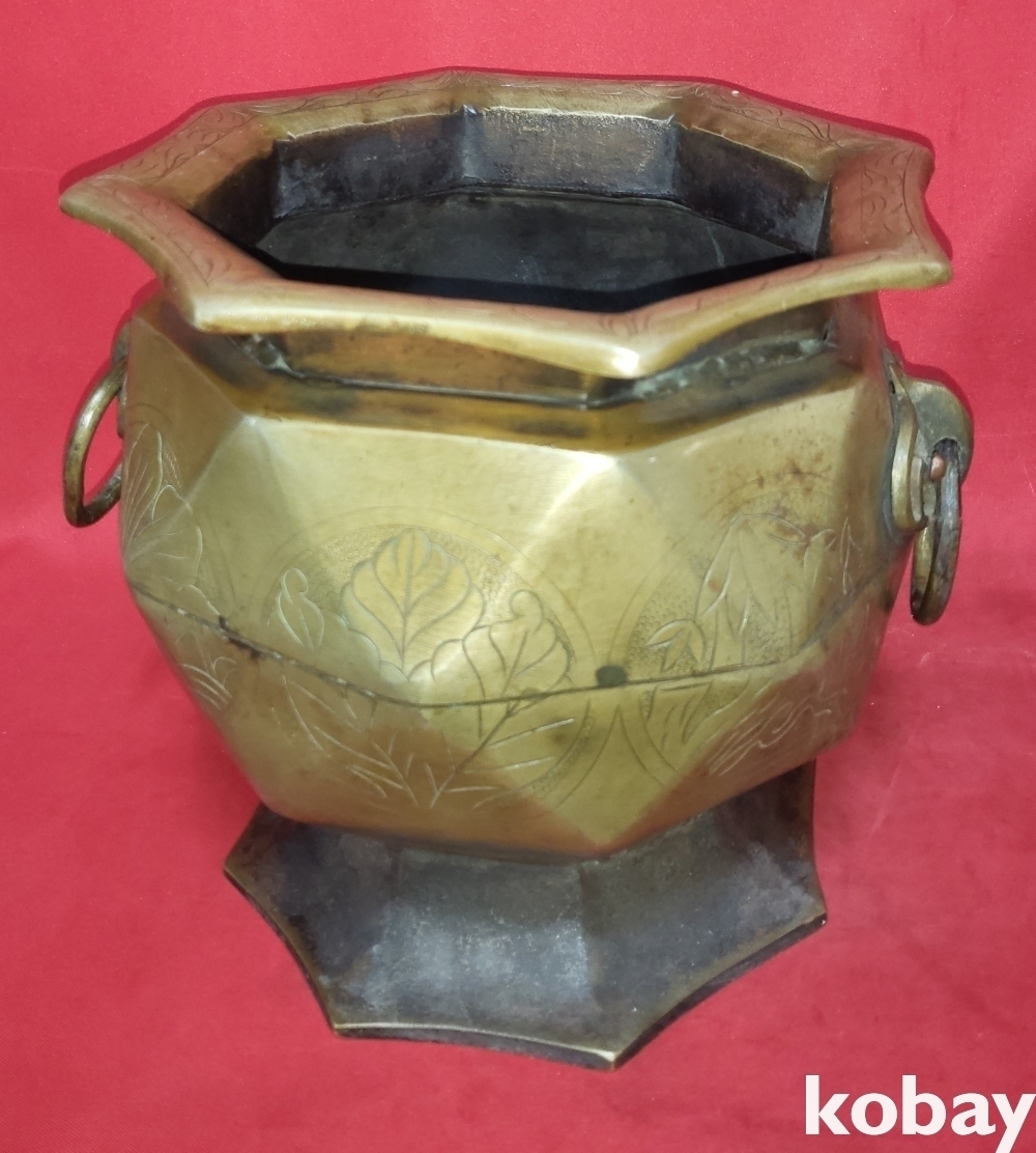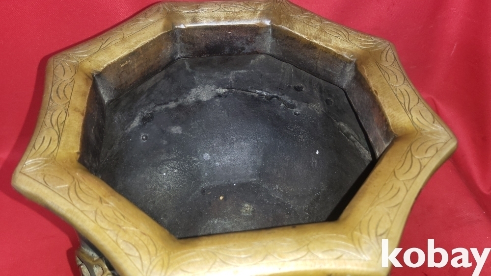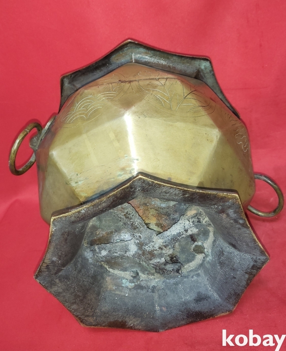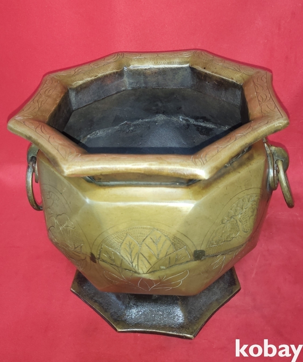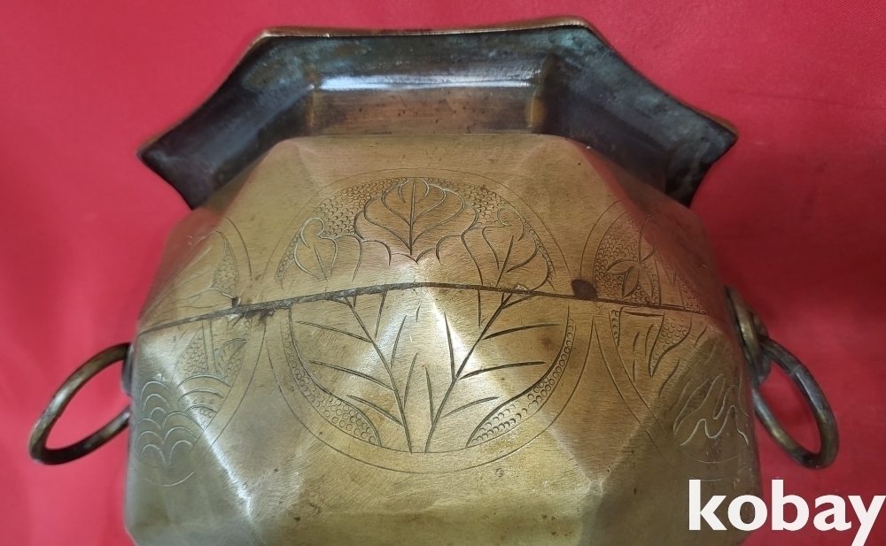 조선시대 청동으로 완성된 소나무.연잎 물결 연밥 문양 양이 8각42면 화로입니다,