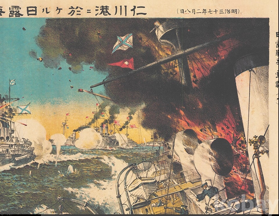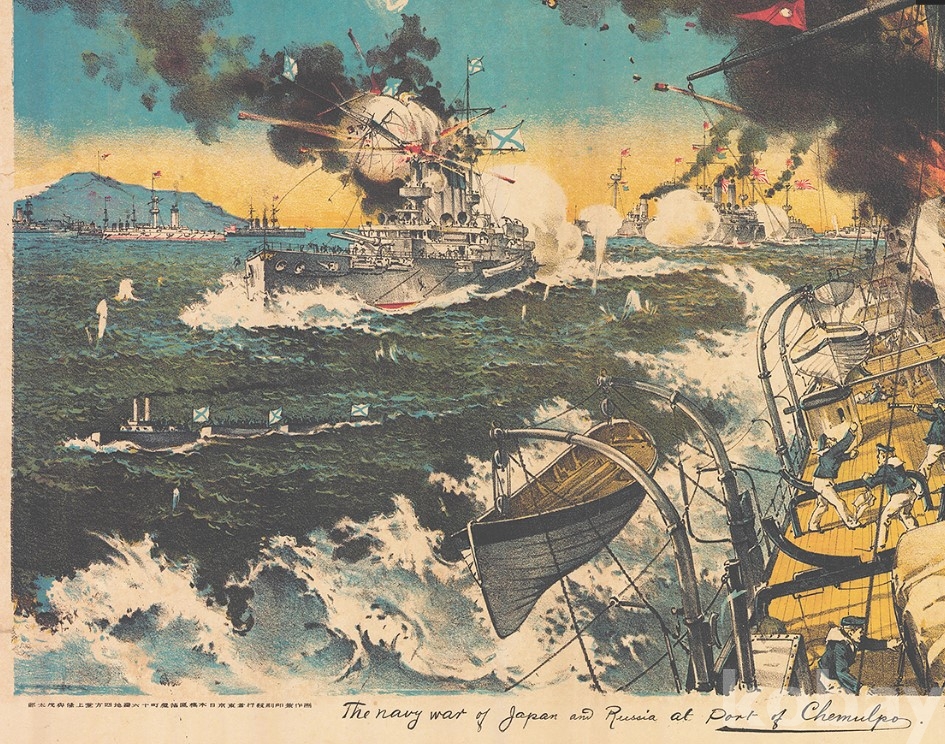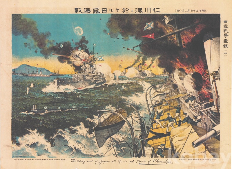 러일전쟁 당시 인천항에서의 해전 모습을 보여주는 목판화입니다.