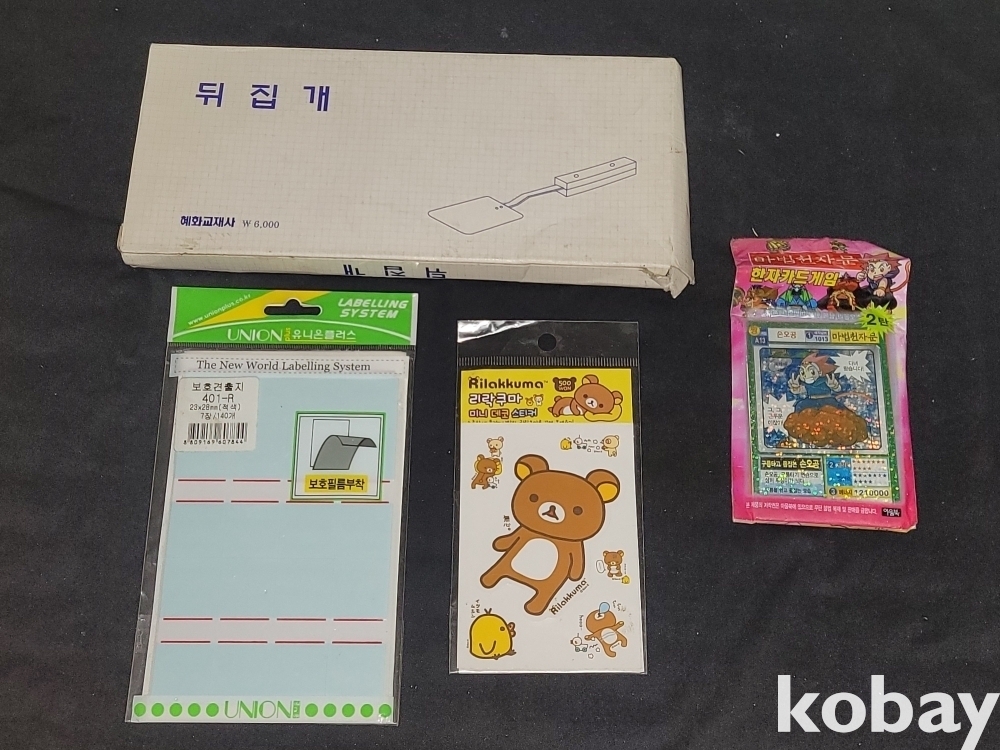 미개봉 포함 혜화교재사 제작 교재용 뒤집개, 보호견출지, 리락쿠마 미니 데코 스티커, 마법 천자문 카드 등 4종 일괄입니다.