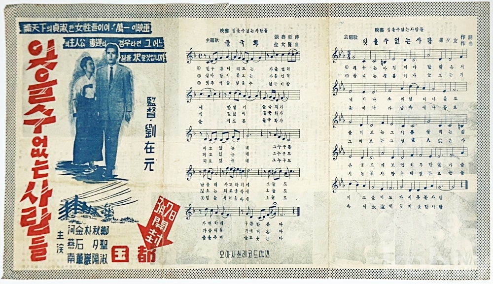 상품 설명 | 6·25 전쟁을 배경으로 한 멜로 영화 '잊을 수 없는 사람들'의 리플렛이다. 영화 주제가 <들국화>, <잊을 수 없는 사람>의 악보가 포함되어있다. | ||