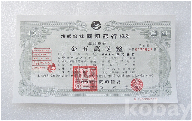 동화은행 50,000원 실물 종이 주식 (809)
