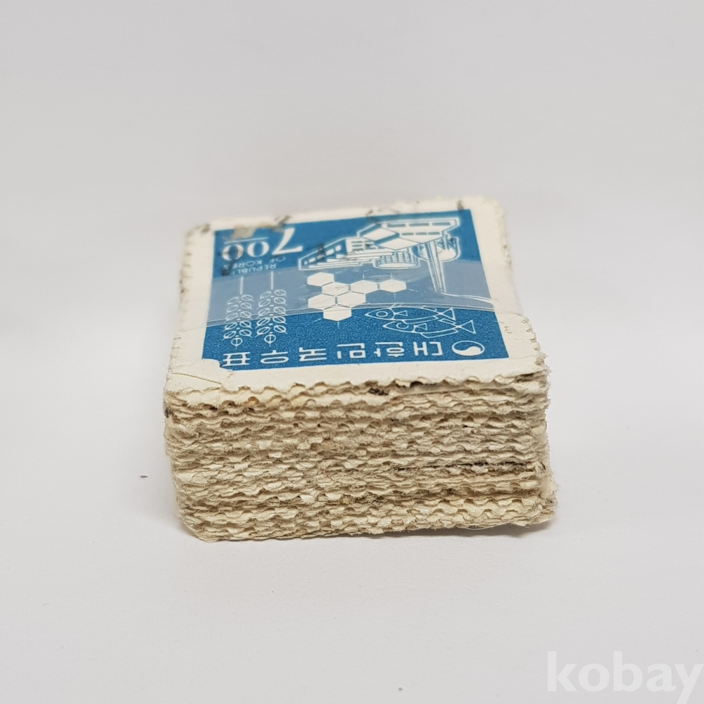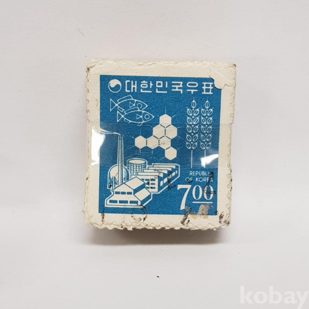 - 1966년 제 2차 국산백지 산업도안 7원 보통우표 일부인 미확인 사용제 우표 약 100매 묶음