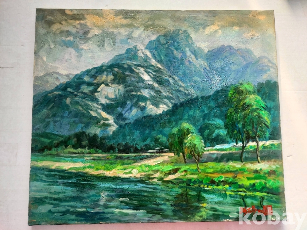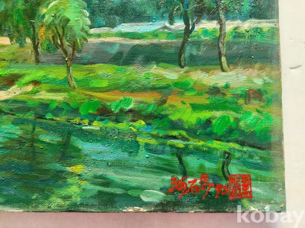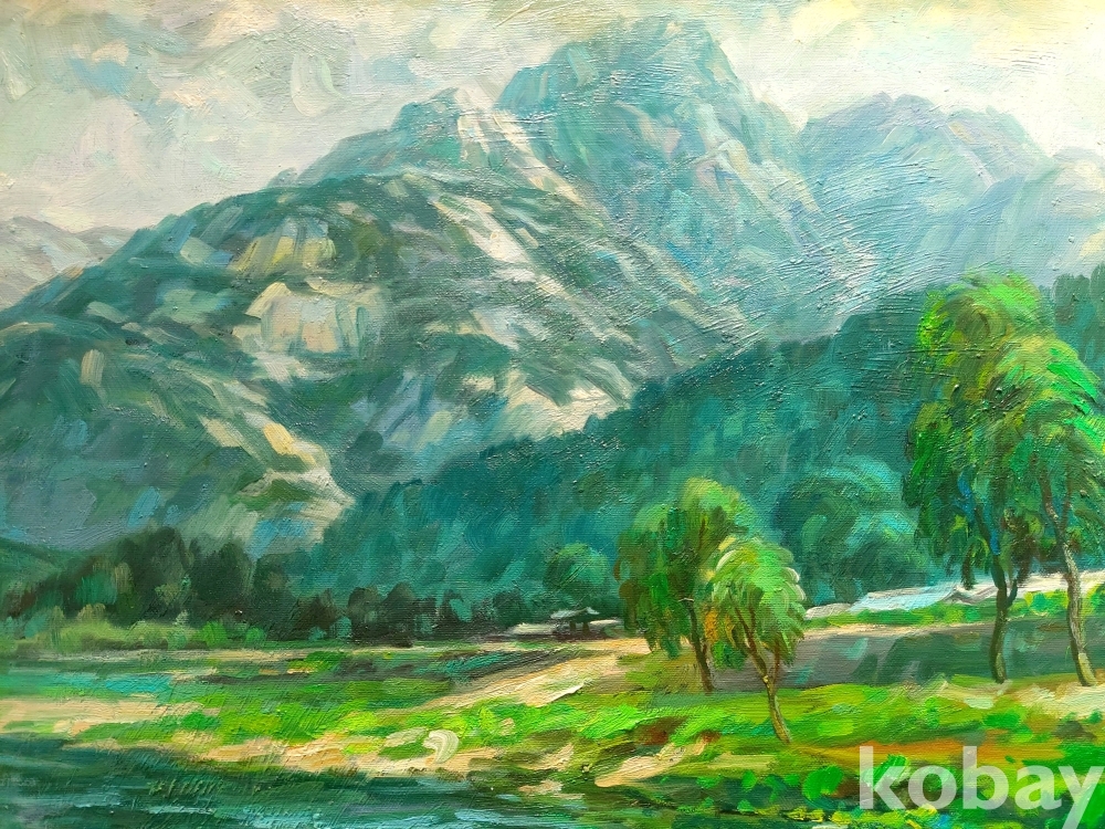 작품 설명: 전경에는 수면과 들판이 완만하게 이어지며 화면 하단을 구성하고 있고, 중경에는 나무와 마을 풍경이 배치돼 있다. 후경에는 산세가 중심을 이루며 화면의 깊이를 형성하고 있다. 녹색과 청색 계열이 중심을 이루며 자연 풍경의 흐름과 공간감이 안정적으로 표현돼 있다.