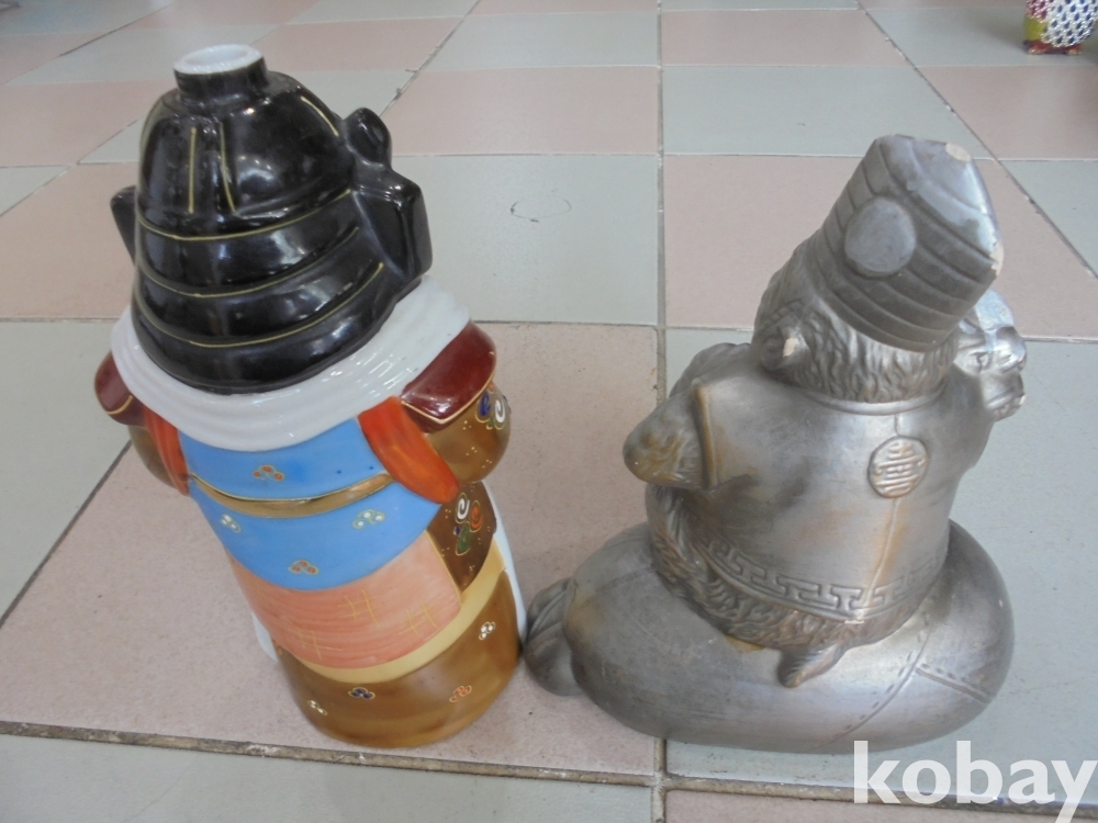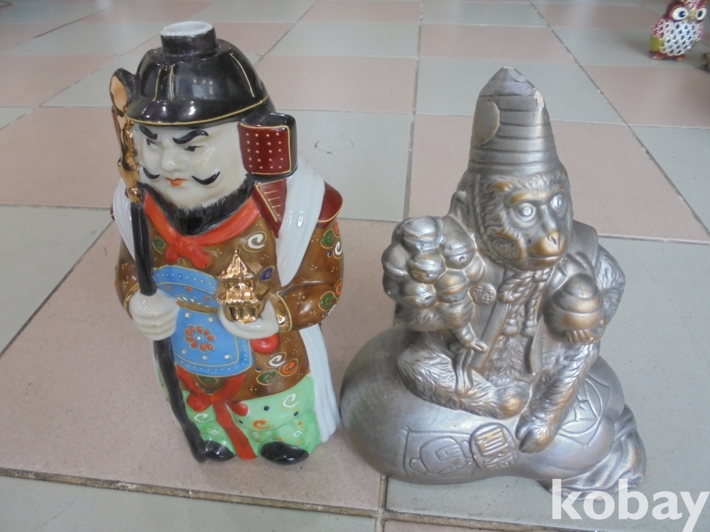 도자기로만든 탑들고 큰칼들고있는 주술적인 대장군과 마불류로만든 방울과 합을들고있고 백량마대자루에앉은 주술적인 원숭이 총2점