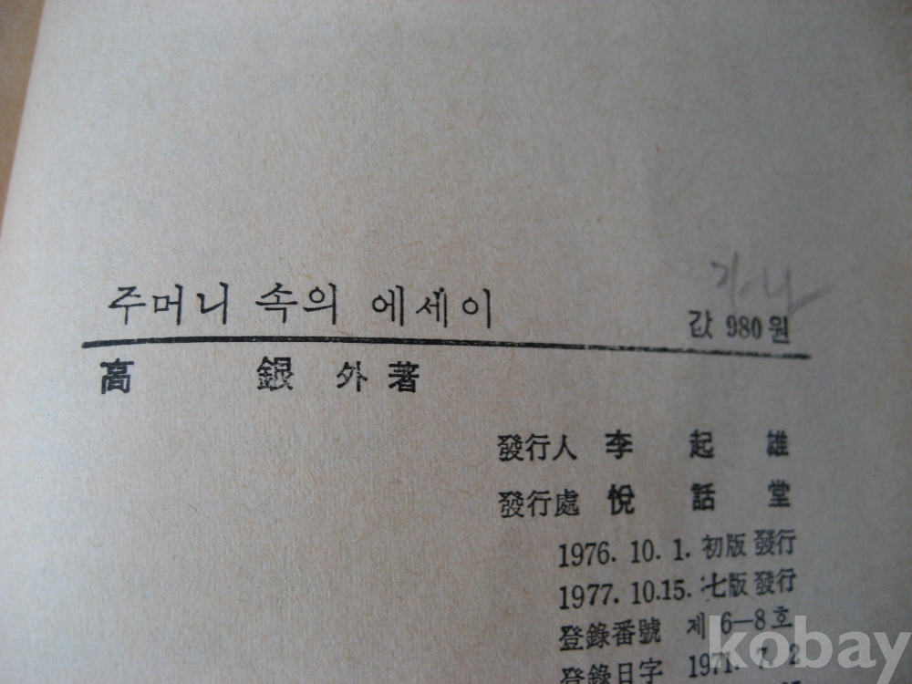 18인의 산문집,,,주머니속의 에세이....고 은 외지음,,,77년