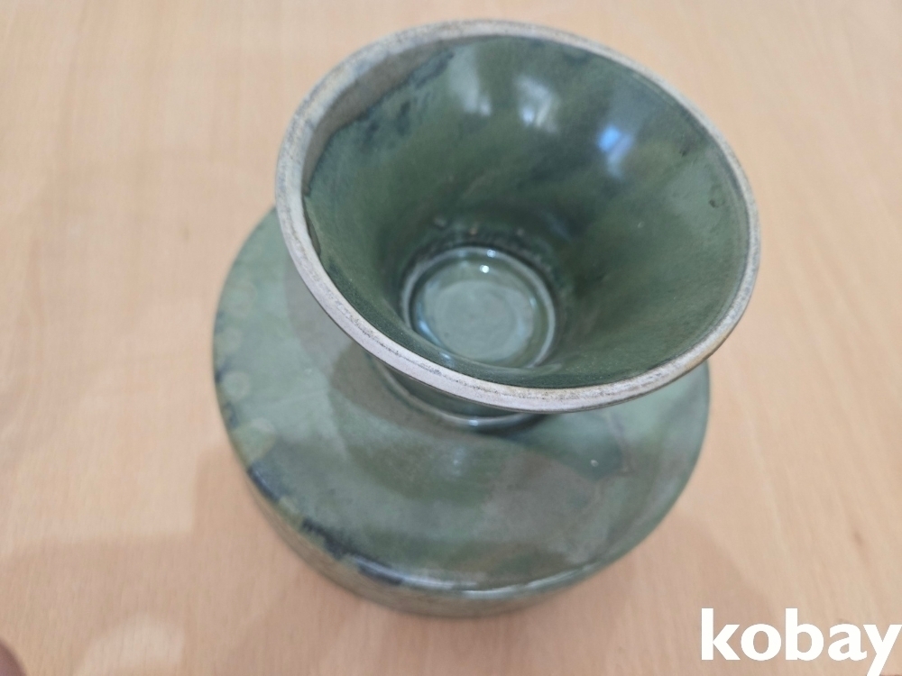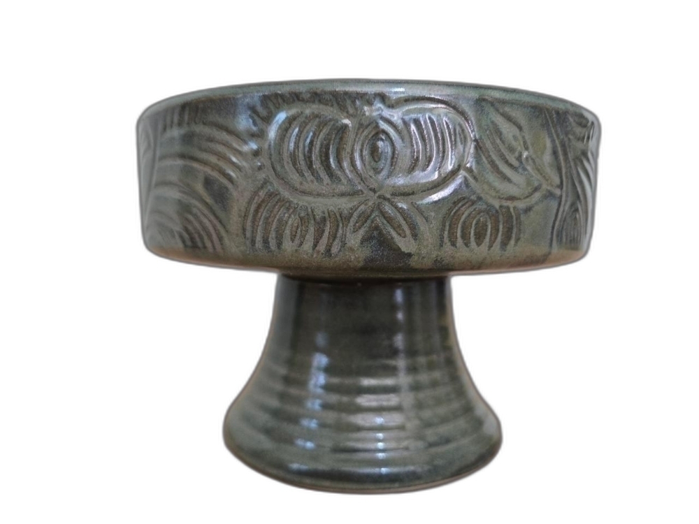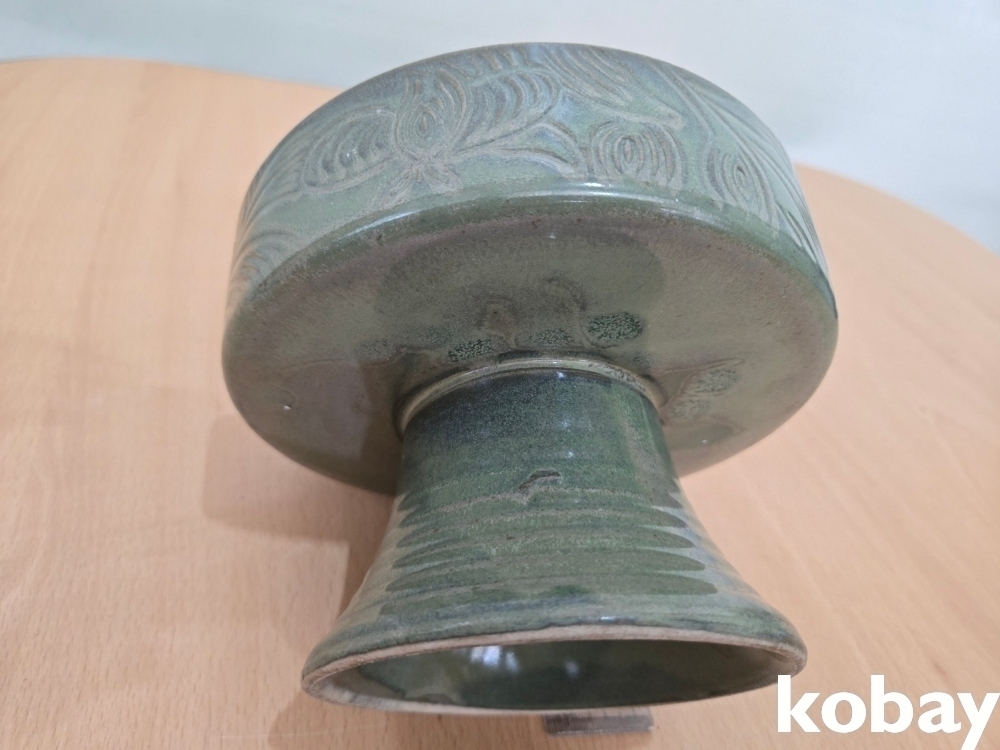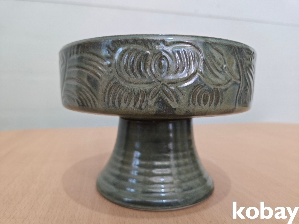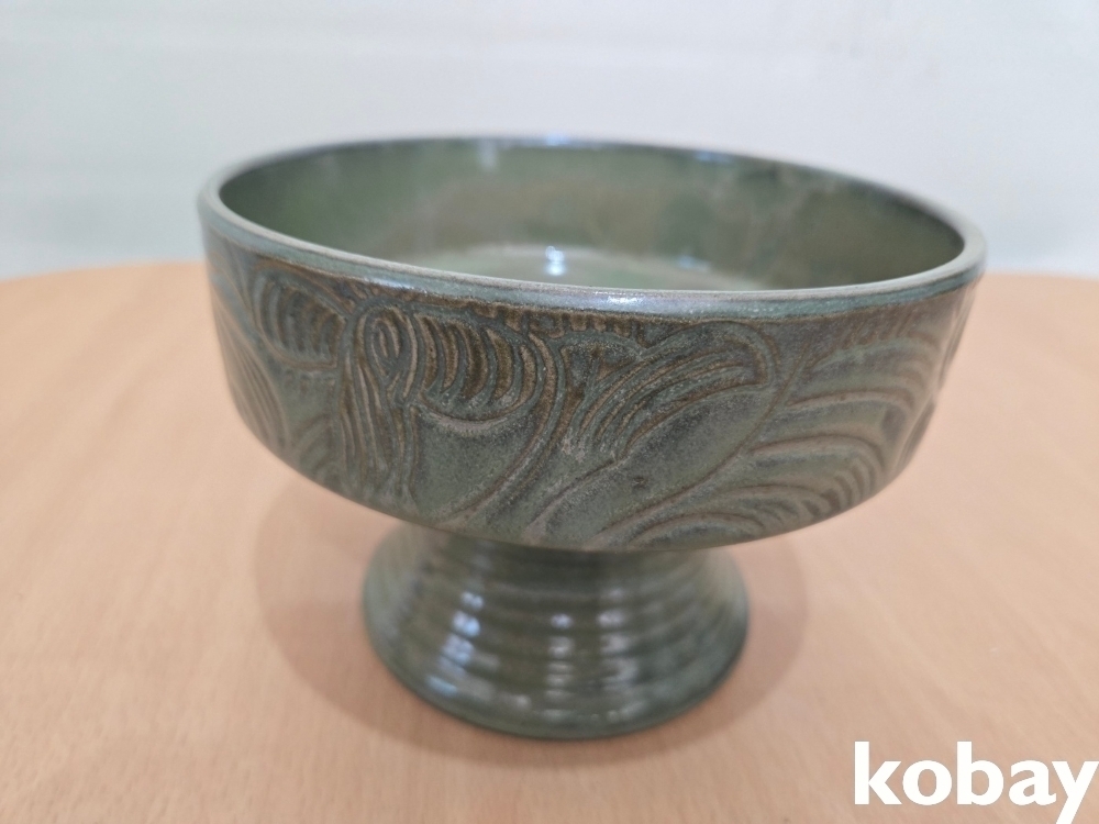 문양이 음각으로 있는 굽이 높은 도자기 입니다.