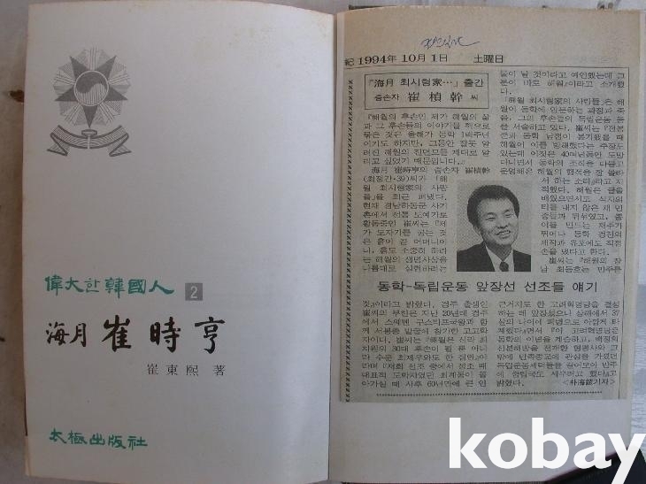 ▒ 1976년 태극출판사에서 15권으로 낸 '위대한 한국인' 두 번째 책으로 최동희 저, <海月 崔時亨>이다.