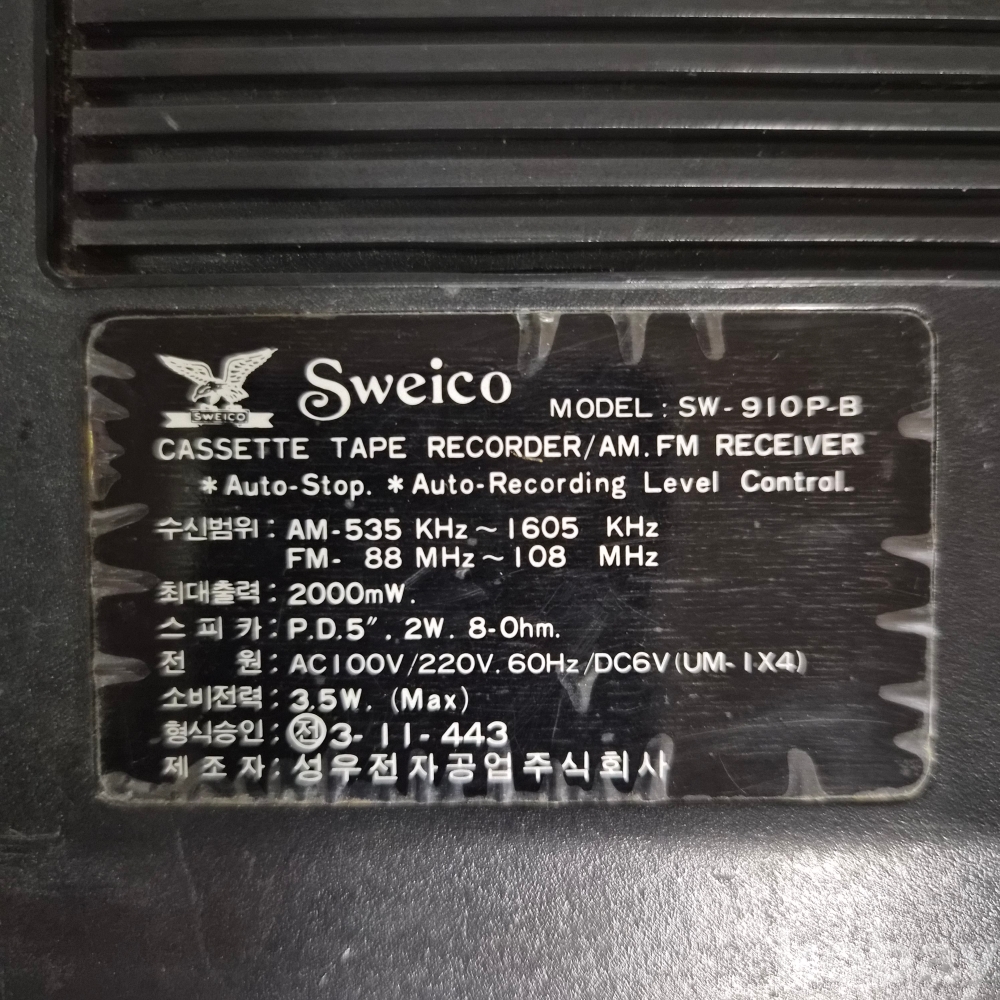 SWEICO SW-910P-B型 카세트 테이프 레코더 & AM/FM 라디오 리시버 이며