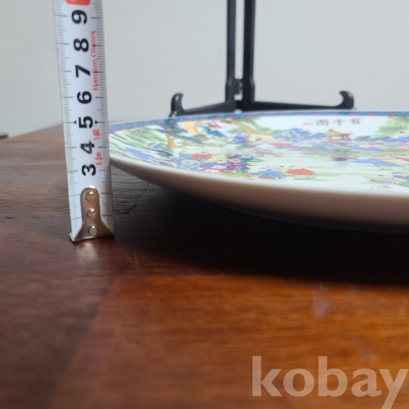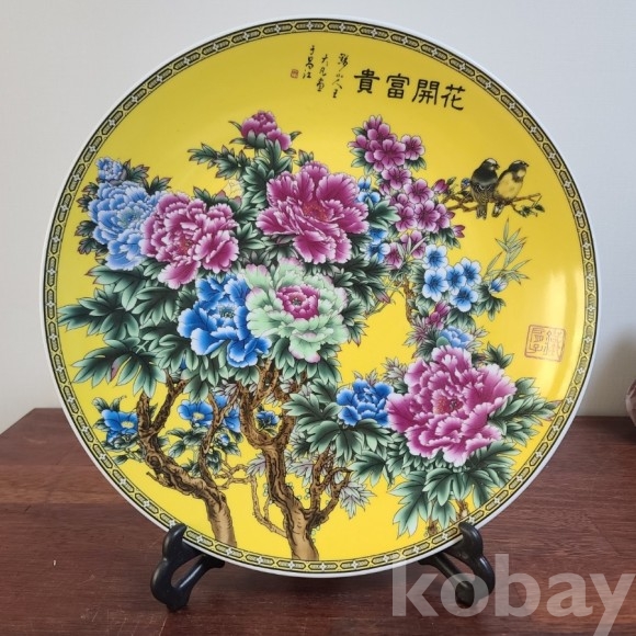 그림이 화려하게 전사된 도자기 접시입니다. 미사용 작품으로 좌대와 함께 제공되며 사이즈와 무게 모두 장식용으로 두고 보시기에 손색없는 작품입니다
