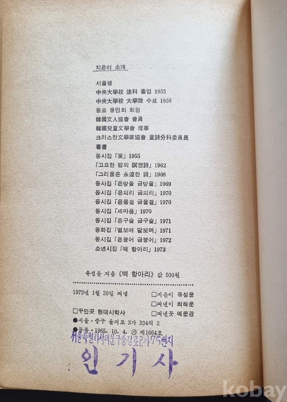 1973년에 발행된 유성윤 시인의 11번째 저서이자 소년시집입니다.