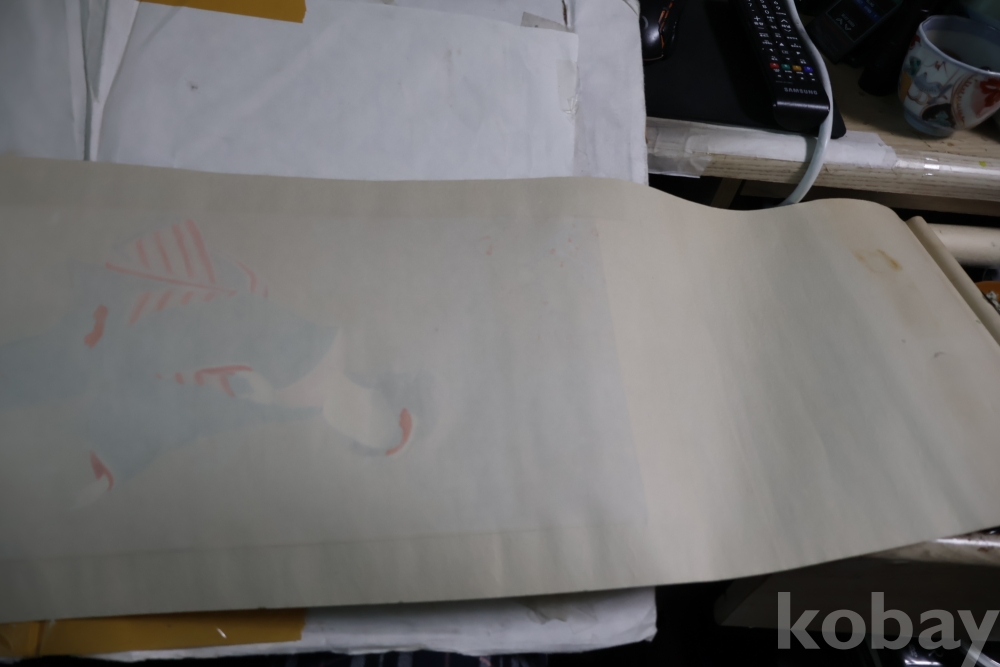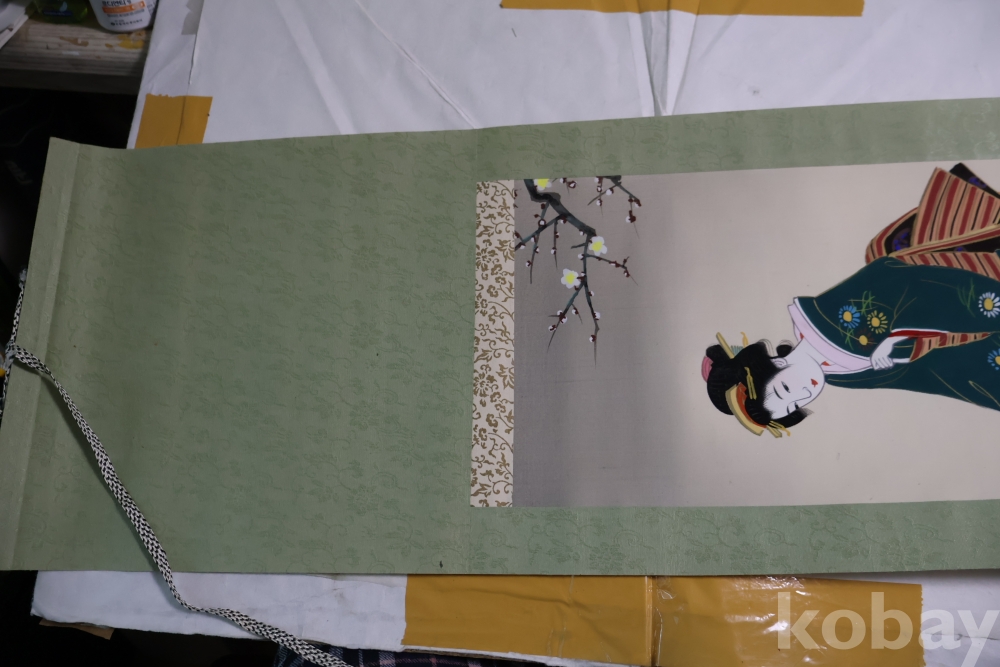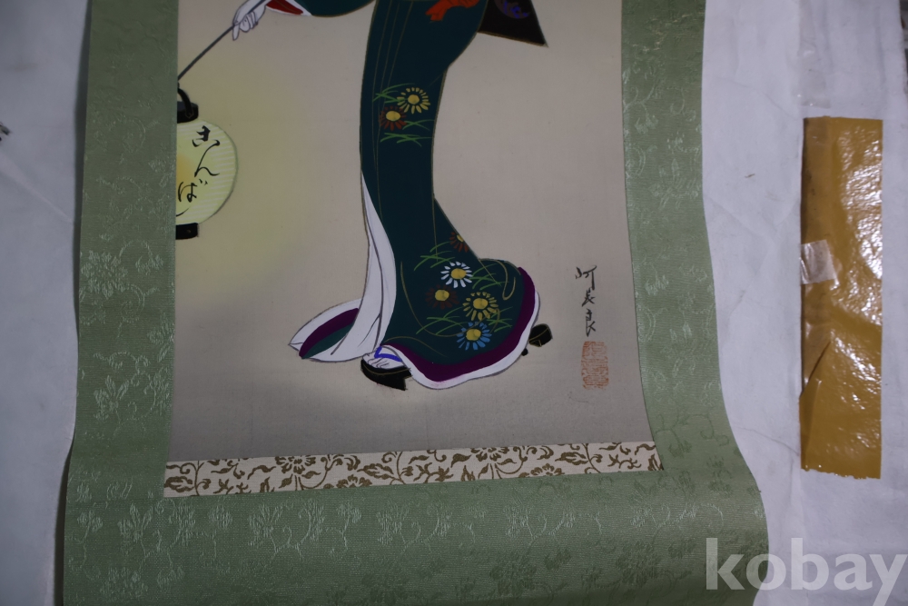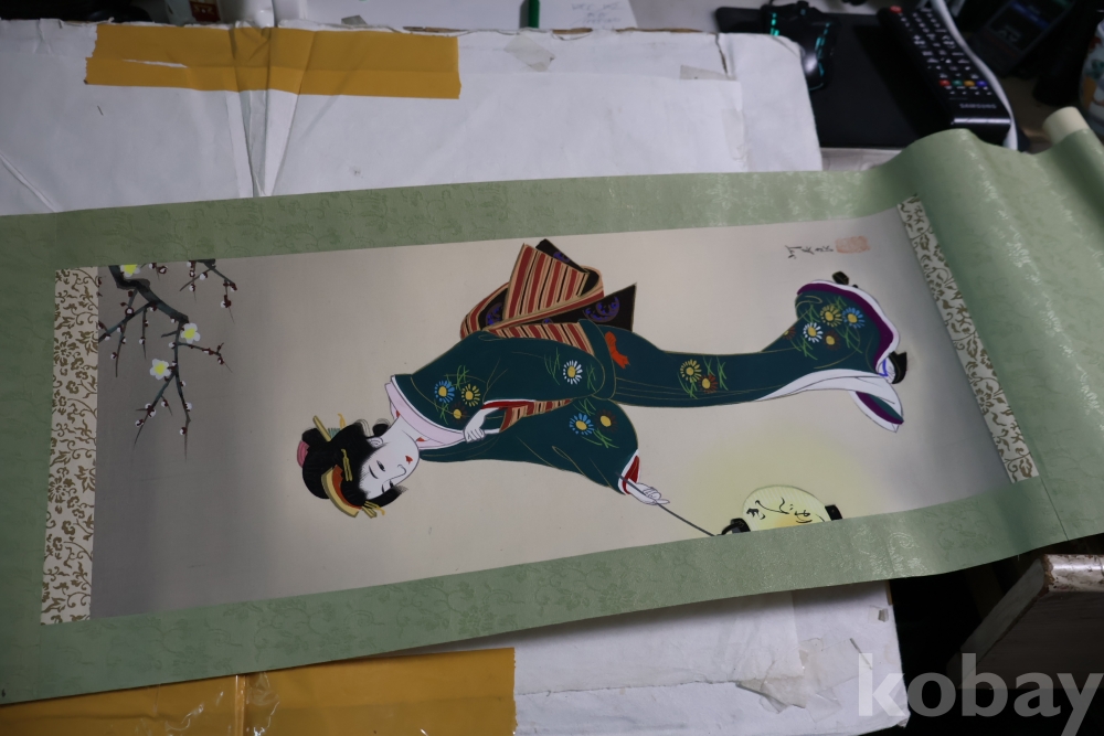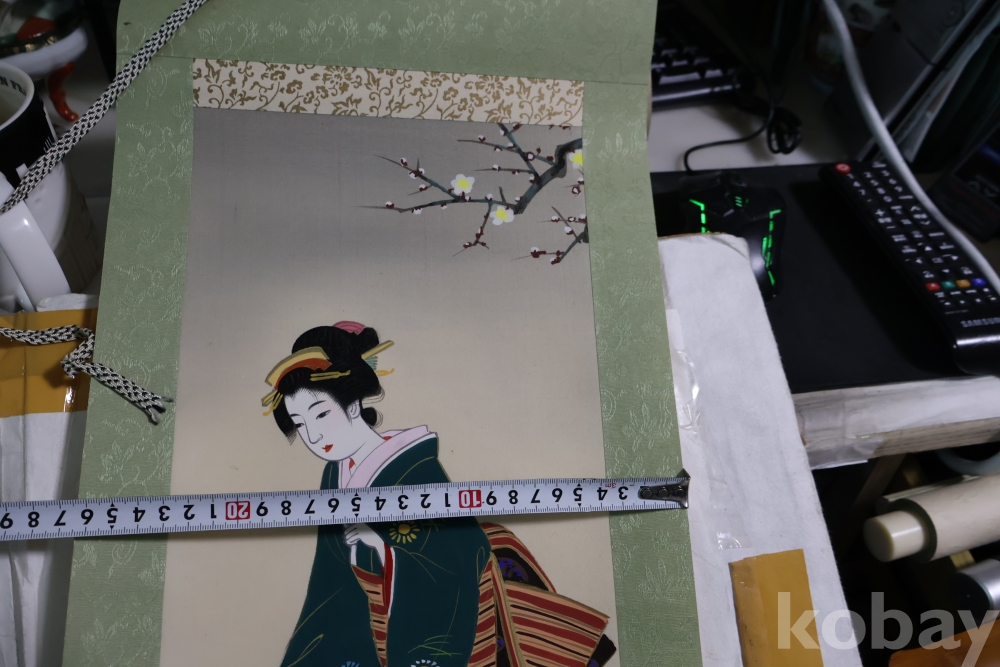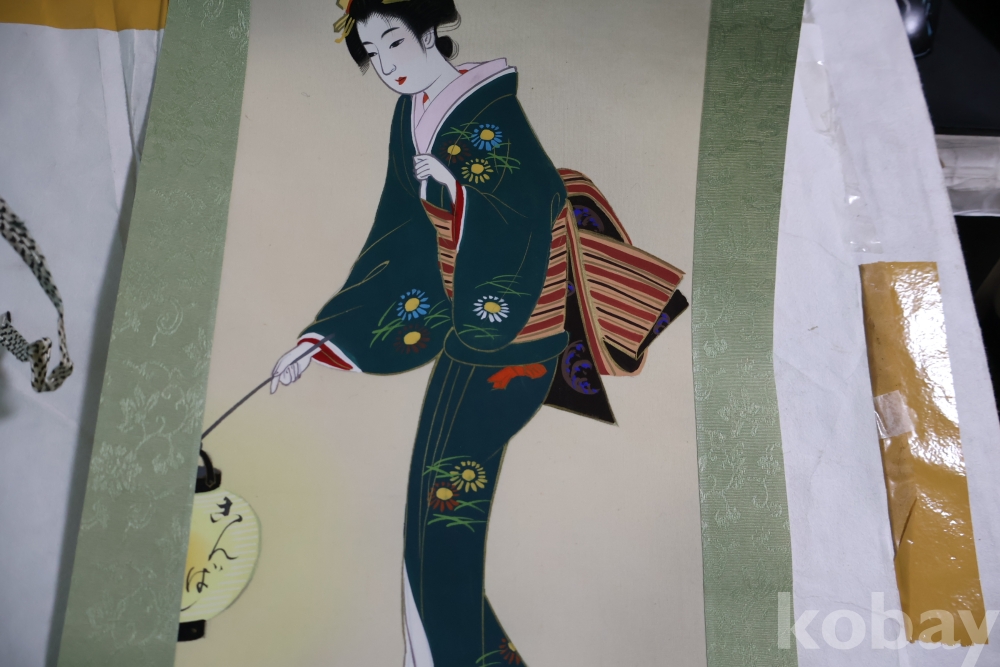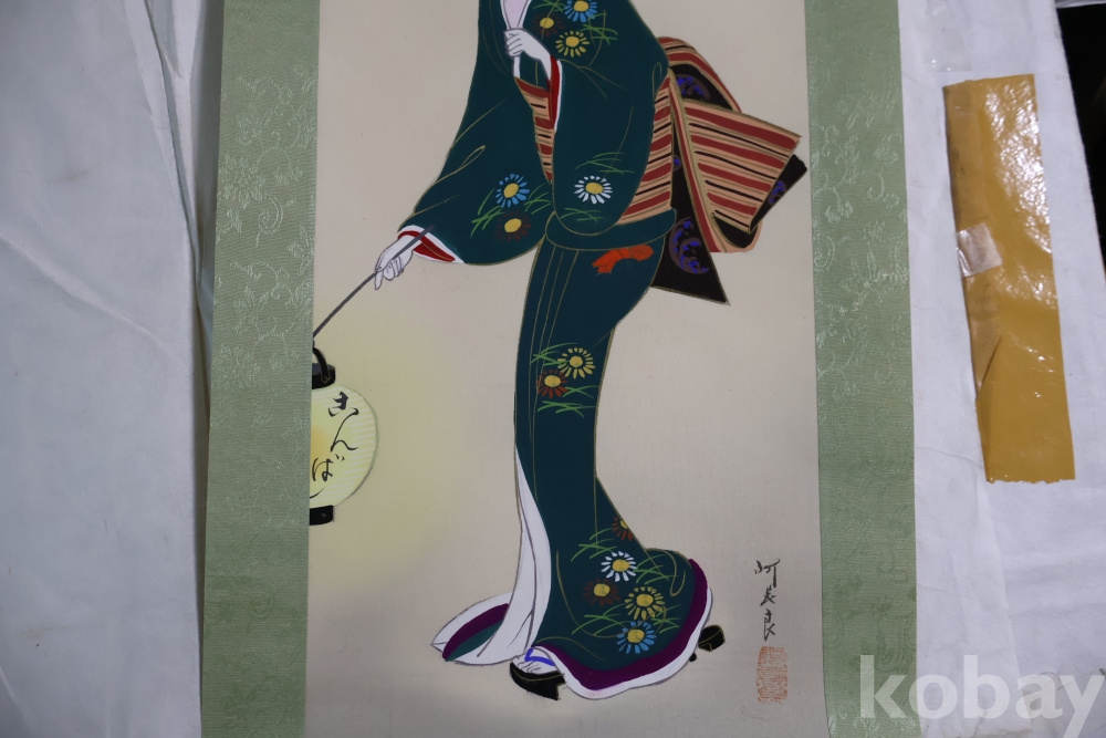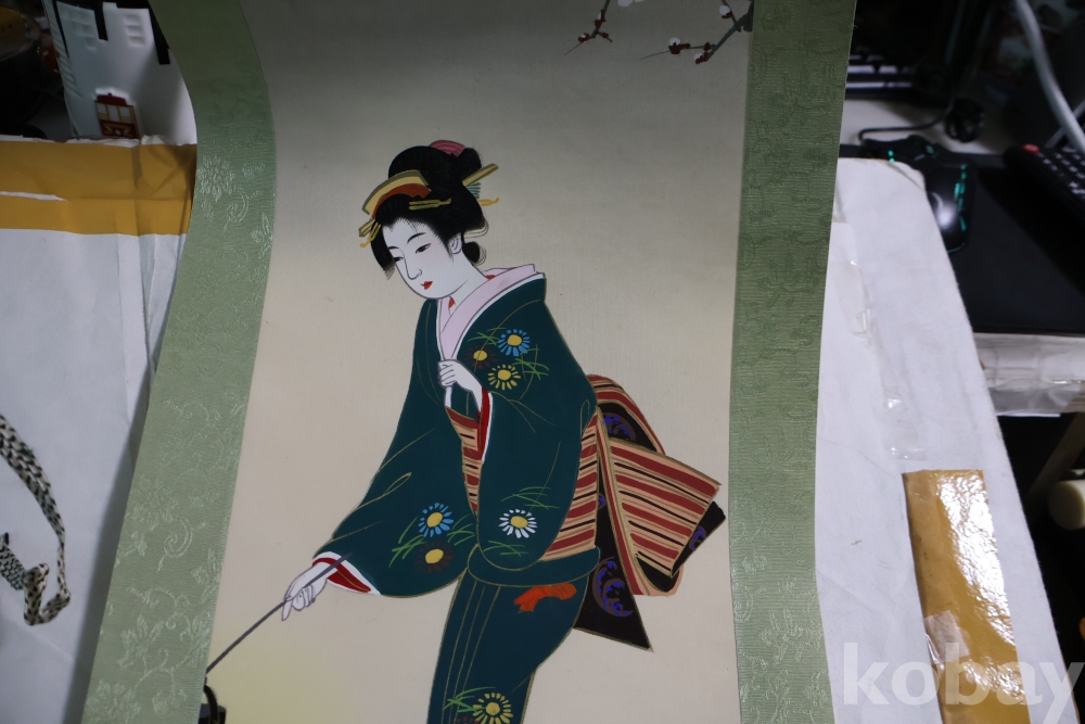 일본 게이샤 비단 족자 이며 화가의 낙관이 보이는 1950대 의 명화 임니다 길이는 96 임니다
