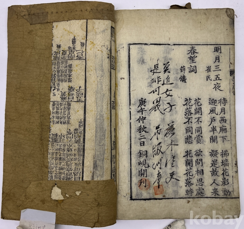 설 명 | ‘오언당음’은 중국 원나라의 양사도(楊士弘)가 엮은 ‘당음(唐音)’을 바탕으로 편집된, 조선시대 선비들의 시를 배울 때 필수적 교과서로 여겨졌다. 초당(初唐)시기의 시를 모은 정시(正始)와 성당(盛唐)시기의 시를 모은 정종(正宗)을 엮은 것이다. 별도 내표지 없이 장차 1부터 시작하고 말미 간기는 ‘경오중추이일동현개간(庚午仲秋二日銅峴開刊)’이다. | |||||