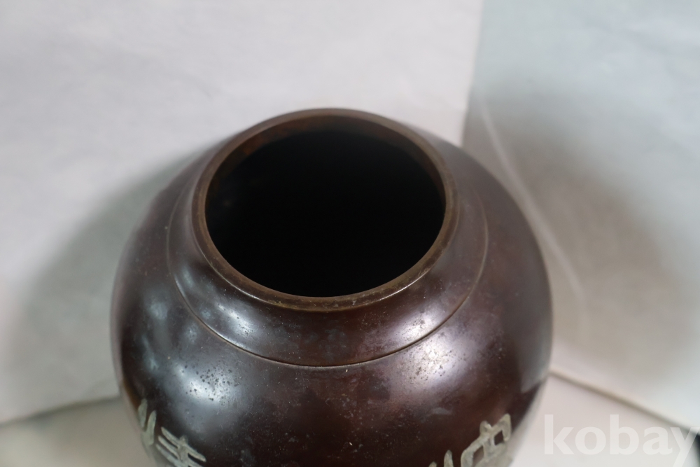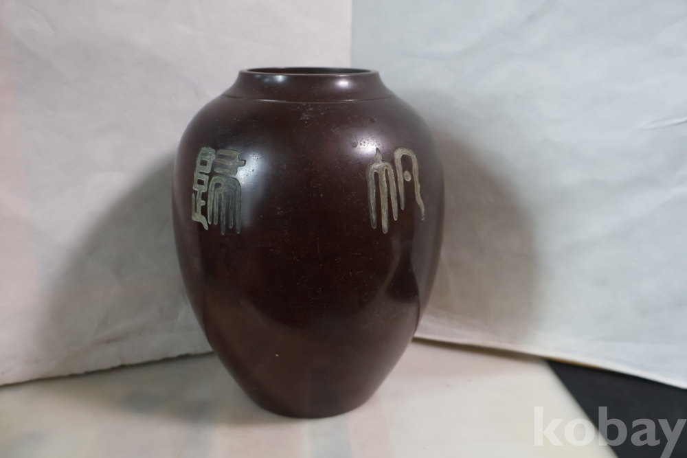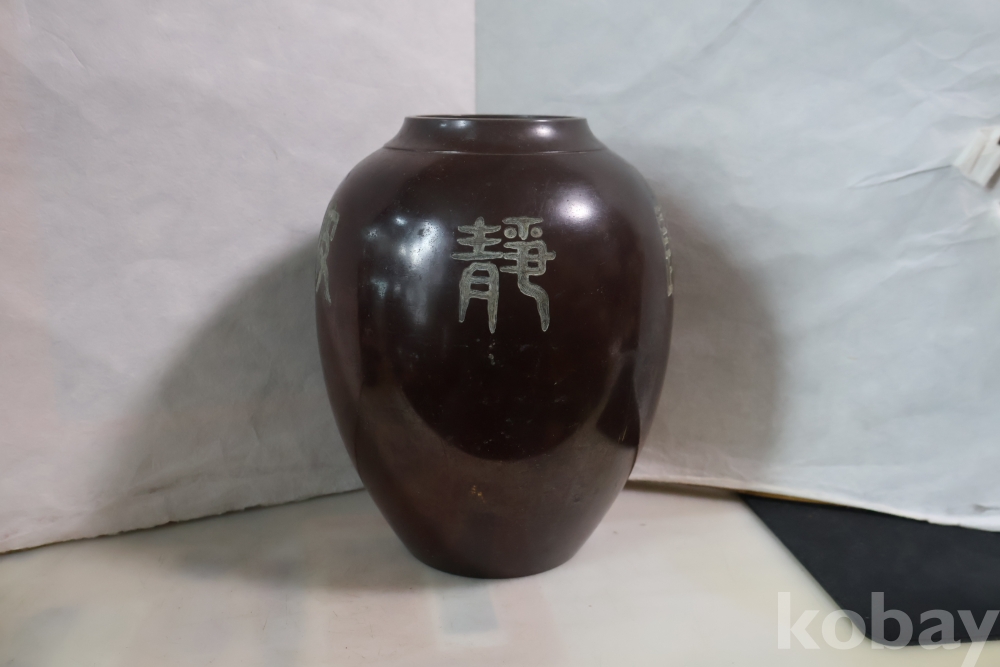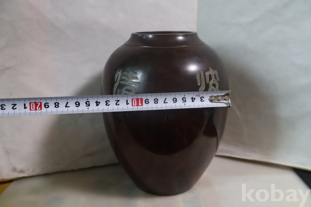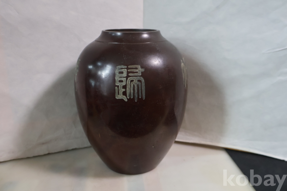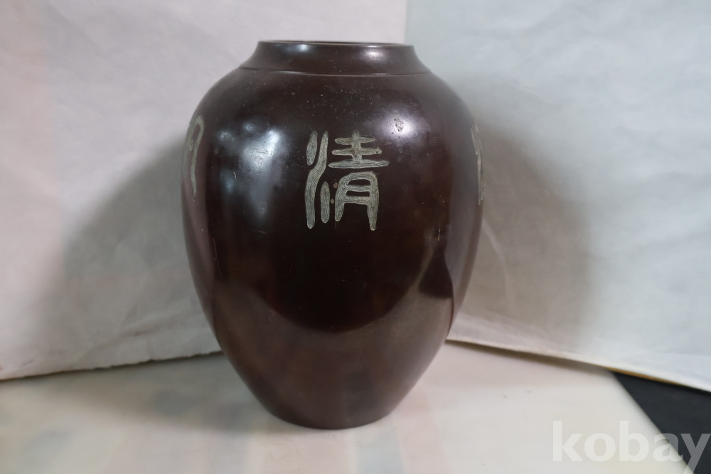 명치기 혹은 1920대의 청동 화병 임니다 묘한 글자를 일일이 조각한 고태미를 가진 정성을 가진 명품 임니다 세월의 스크래치가 보이는 유일무이한 묵직한 명물 임니다