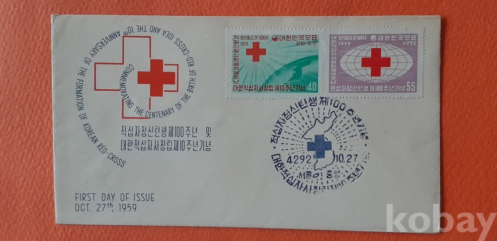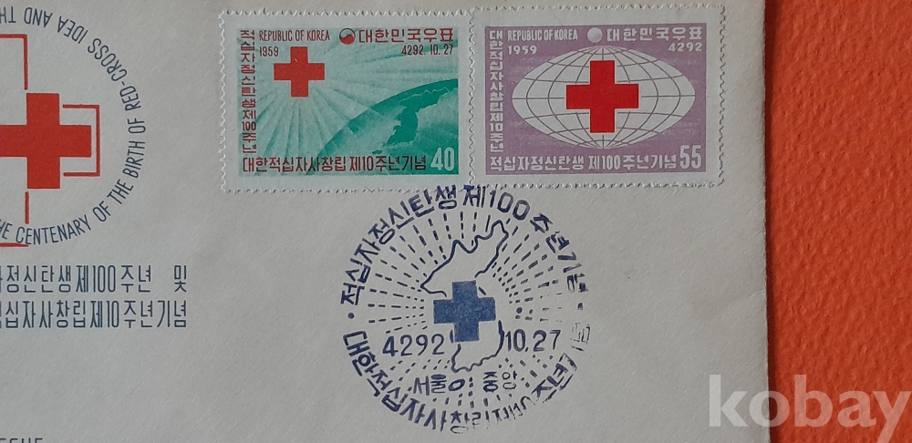 1959년 발행 적십자 정신 탄생 100주년 기념 초일봉피 입니다.
