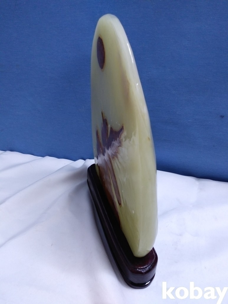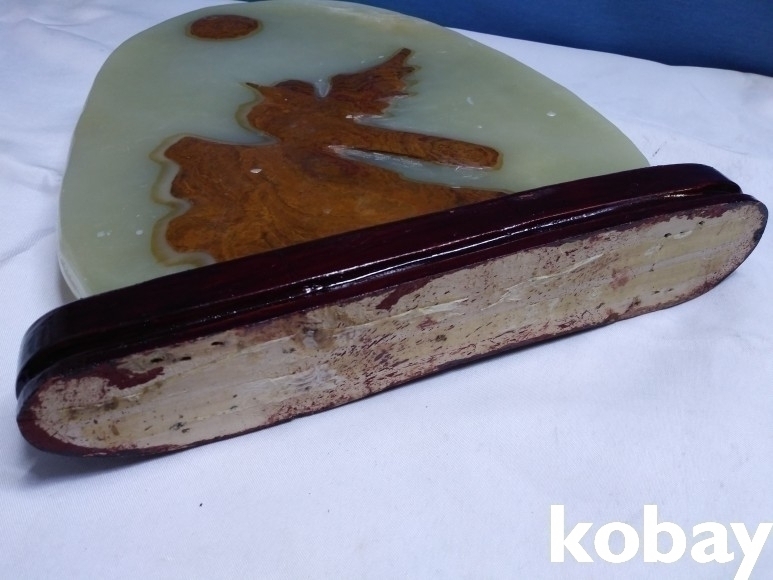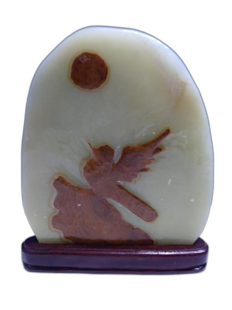 나무 위에 새가 해를 바라보고 있는 형상이 있는 옥돌 수석 입니다.