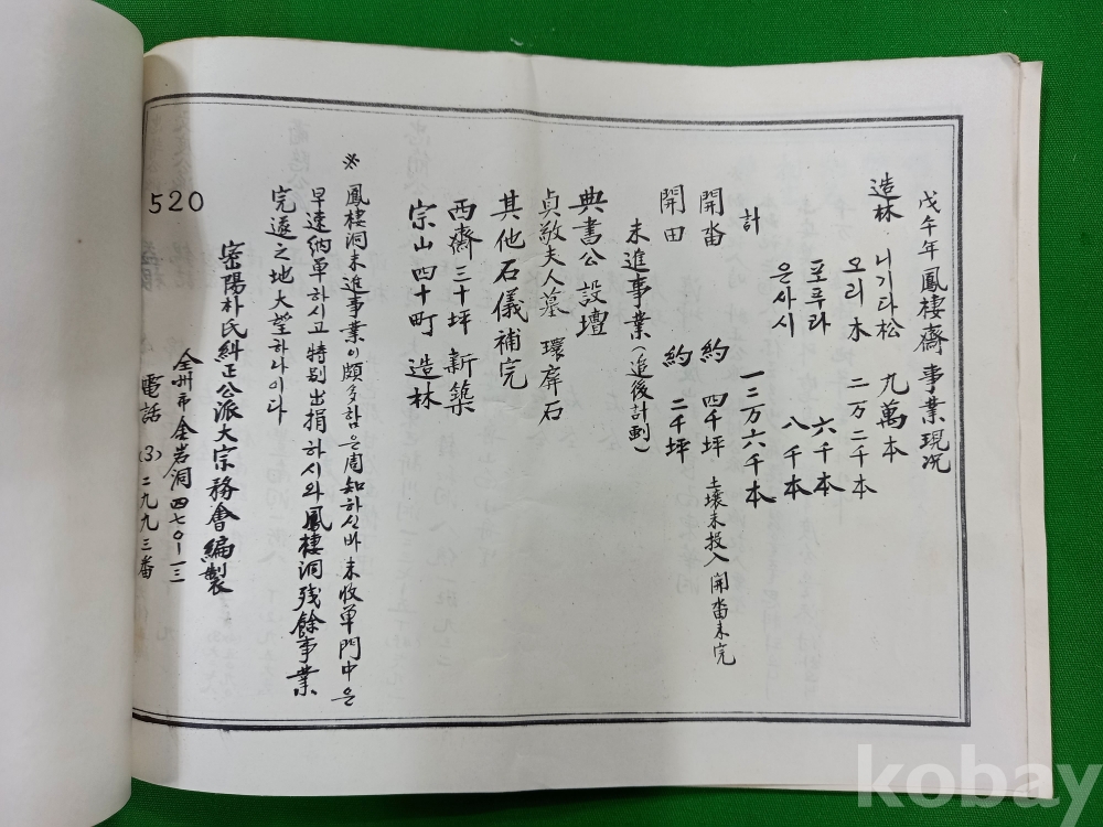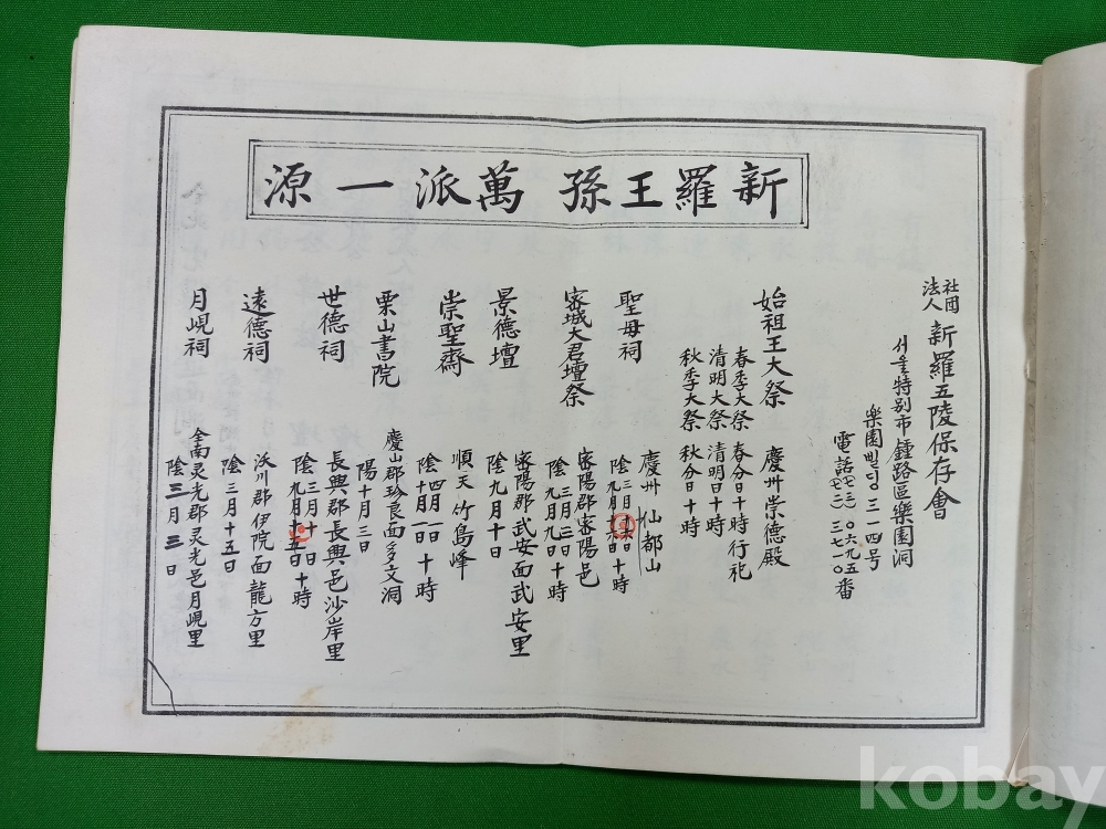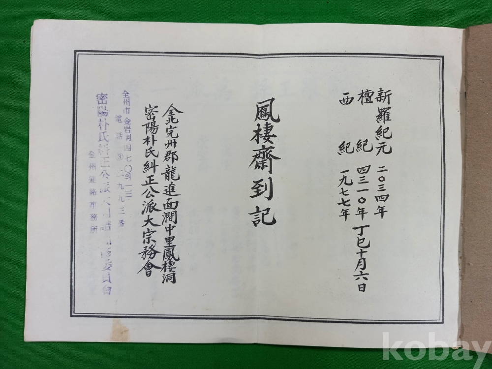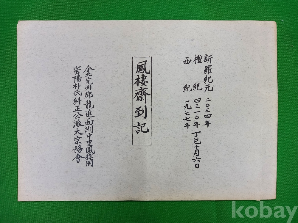 이 문서는 1977년 전북 완주군에 위치한 밀양 박씨 규정공파의 재실인 봉서재(鳳棲齋)에서 작성된 기록입니다. 박씨의 시조인 박혁거세와 알영부인, 그리고 남해·유리·파사왕의 능을 관리하는 보존회에서 종친들에게 행사를 안내하기 위해 제작되었습니다.