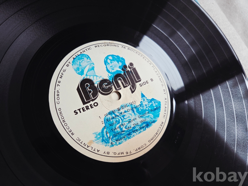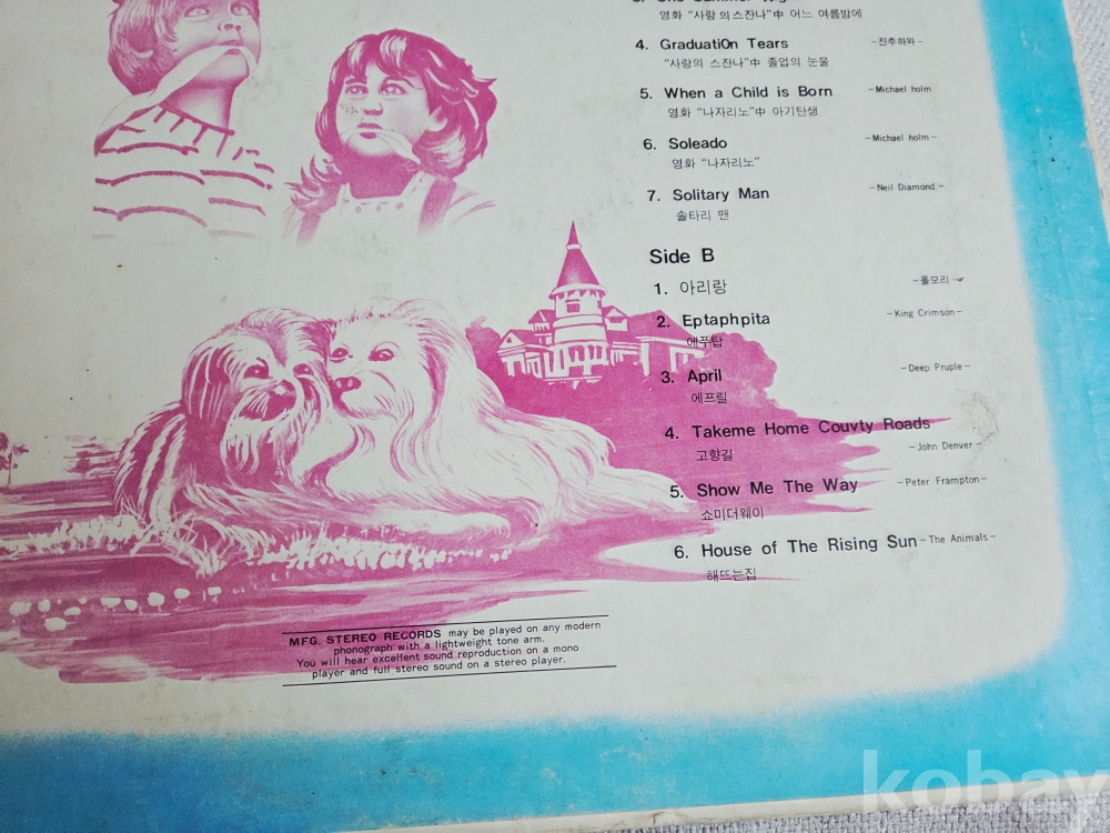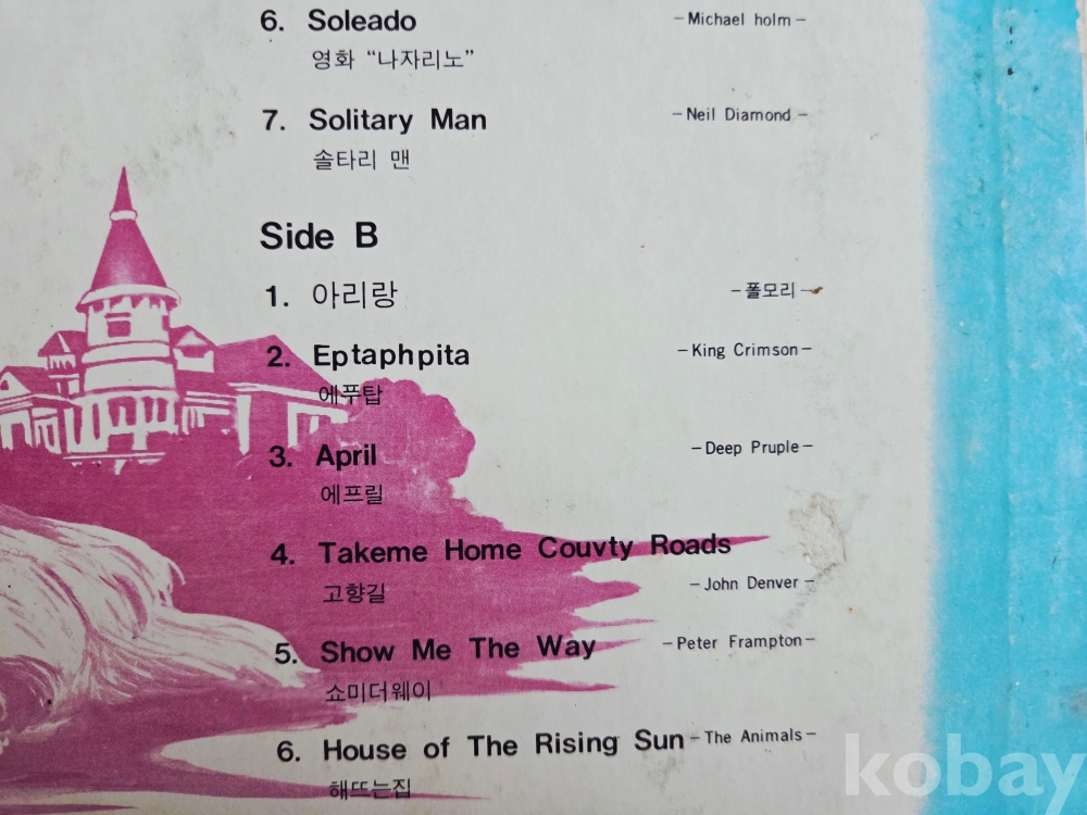 • 음반 정보: 하단에는 스테레오 레코드를 모노 플레이어에서도 재생할 수 있다는 안내 문구가 영문으로 적혀 있으며, 오타(Eptaphpita, Takeme Home Couvty Roads 등)가 군데군데 발견되는 것으로 보아 70년대 당시 시대 모습을 볼수 있는 시대자료입니다