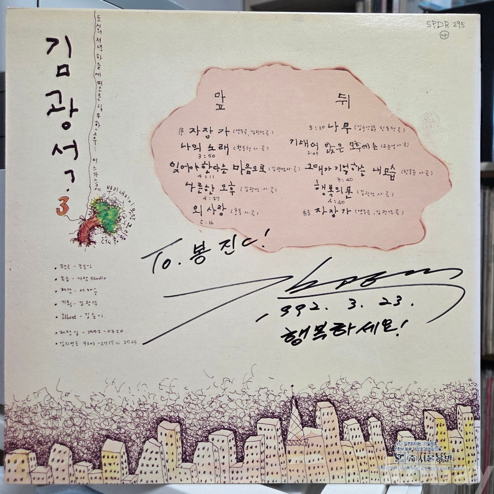 자켓 뒷면에 김광석 씨의 친필사인이 있습니다. SIDE A 1.序.자장가 2.나의 노래 3.잊어야 한다는 마음으로 4.나른한 오후 5.외사랑 SIDE B 1.나무 2.기대어 앉은 오후에는 3.그대가 기억하는 내 모습 4.행복의 문 5.結.자장가