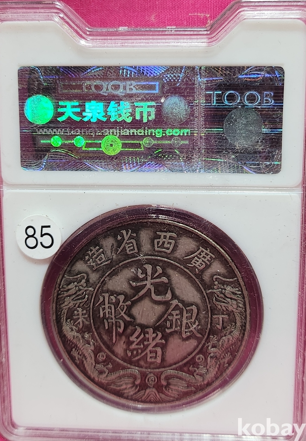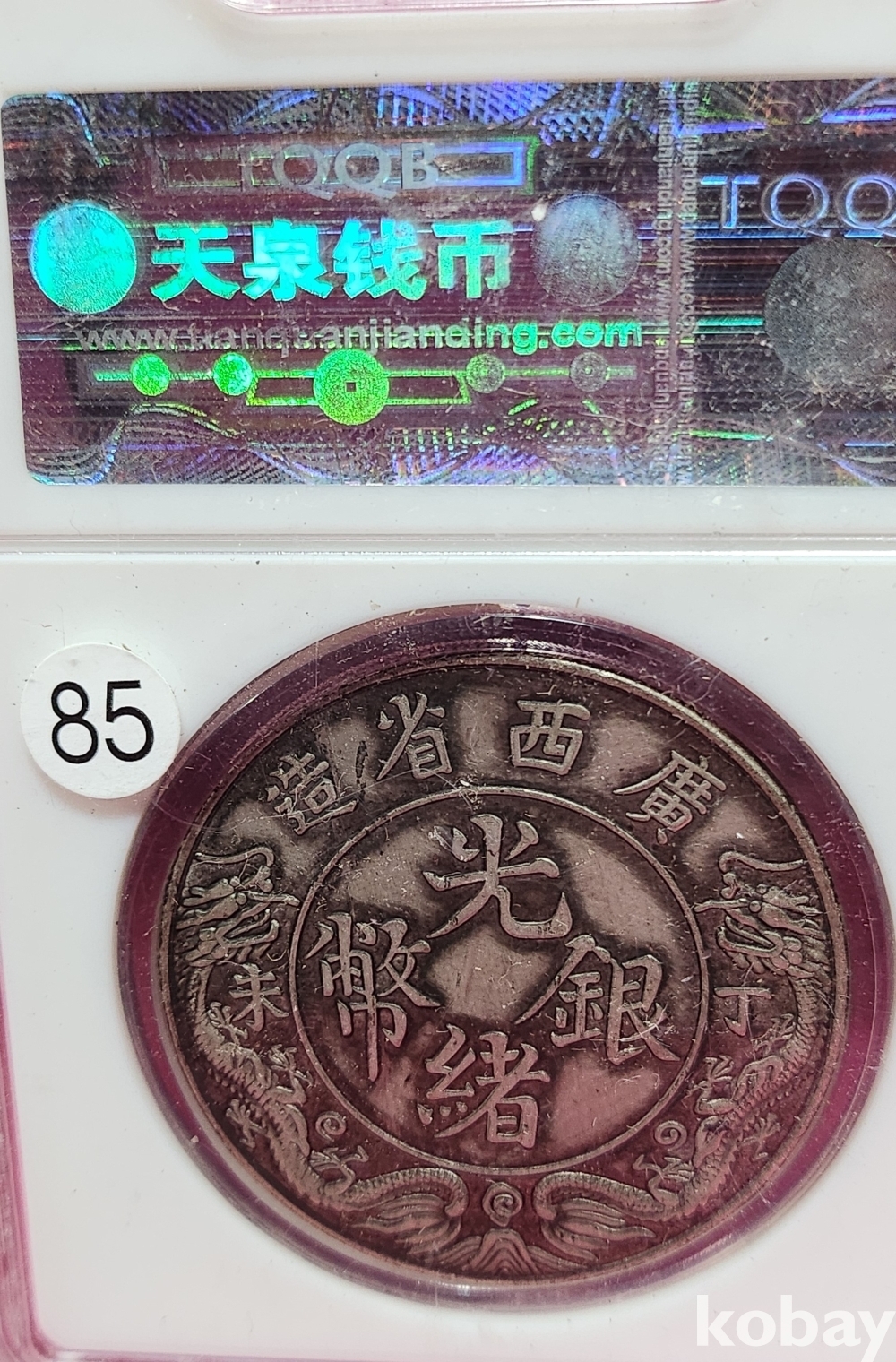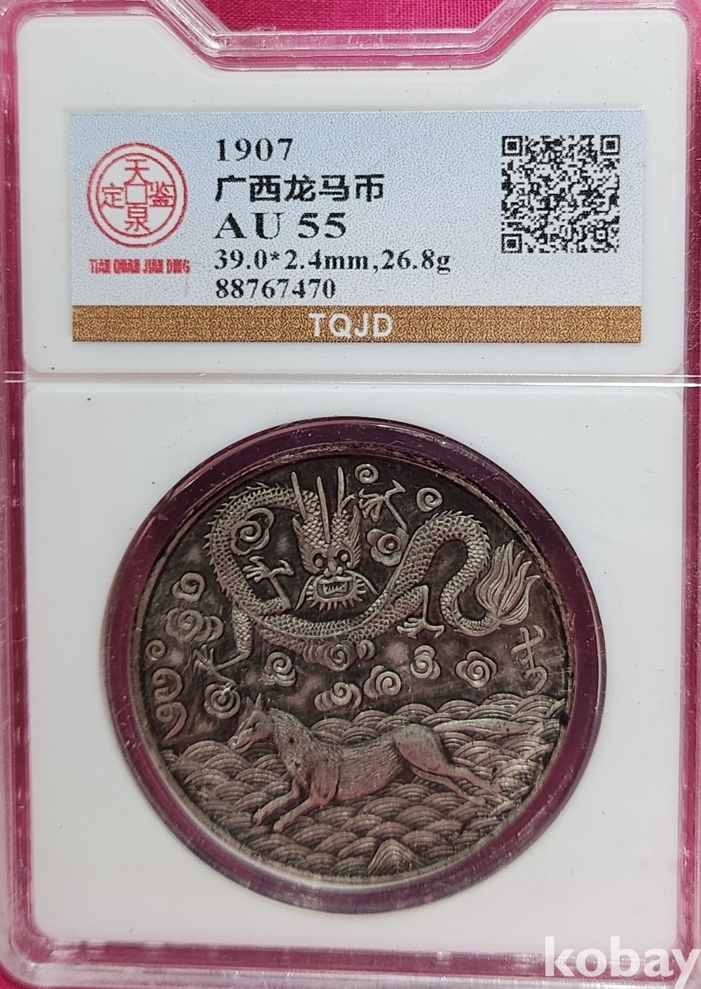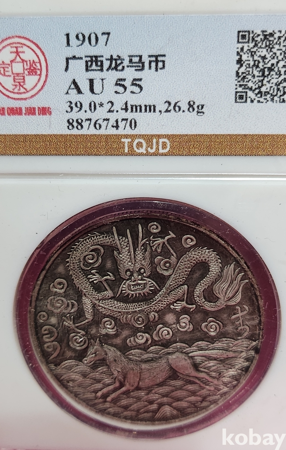 1907년 큐알코드(QR CODE)가 함께하는 은색 광서원보 (光緖元寶) 화패로 밀봉된 상태입니다,