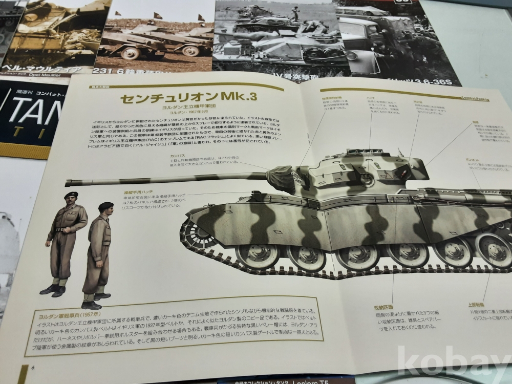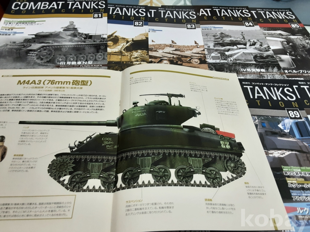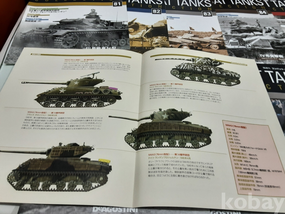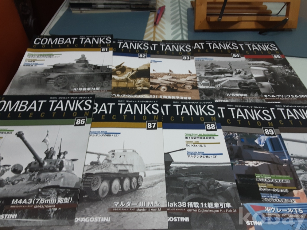 1. 데오고스티니(DeAGOSTINI) 전투 탱크 컬렉션은 다양한 국가의 제2차 세계 대전 및 냉전 시대를 대표하는 탱크들을 정교하게 재현한 1:72 스케일의 모형 120종 시리즈로 각 모델에는 디스플레이 케이스, 탱크모형과 잡지가 함께 제공된다. 전세계적으로 수집가들에게 인기가 많은 데오고스티니(DeAGOSTINI) 탱크 모델 해설서인 잡지 전 120종 판매. 81. 3호전차 N형 82. 82. 오펠 몰티에르 83. Sd. Kfz 231 중장갑 정찰 84. 4호 자주포 Sturmgeschutz 85. Opel Blitz 3.6 86. M4A3 셔먼 87. 자주포 Marder 88. Flak 38 탑재 견인차 89. Leclerc T5 90. Centurion Mk.3