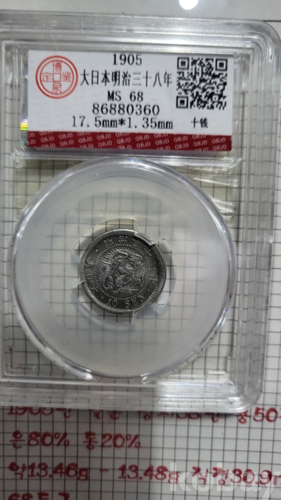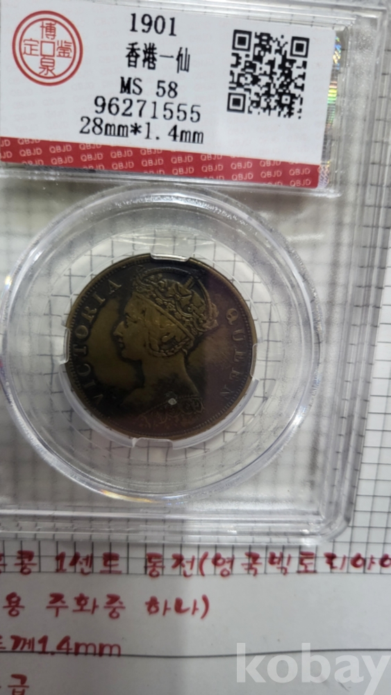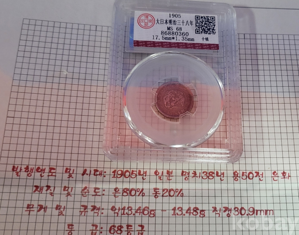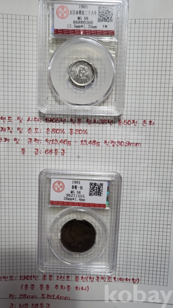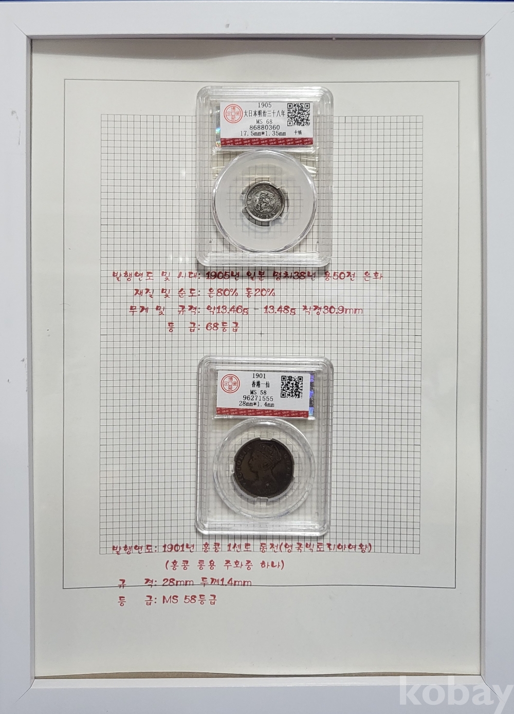 1905년 일본 명치 38년 50전 은(銀)화 1901년 홍콩1센트 동전(영국 빅토리아 여왕)액자입니다,