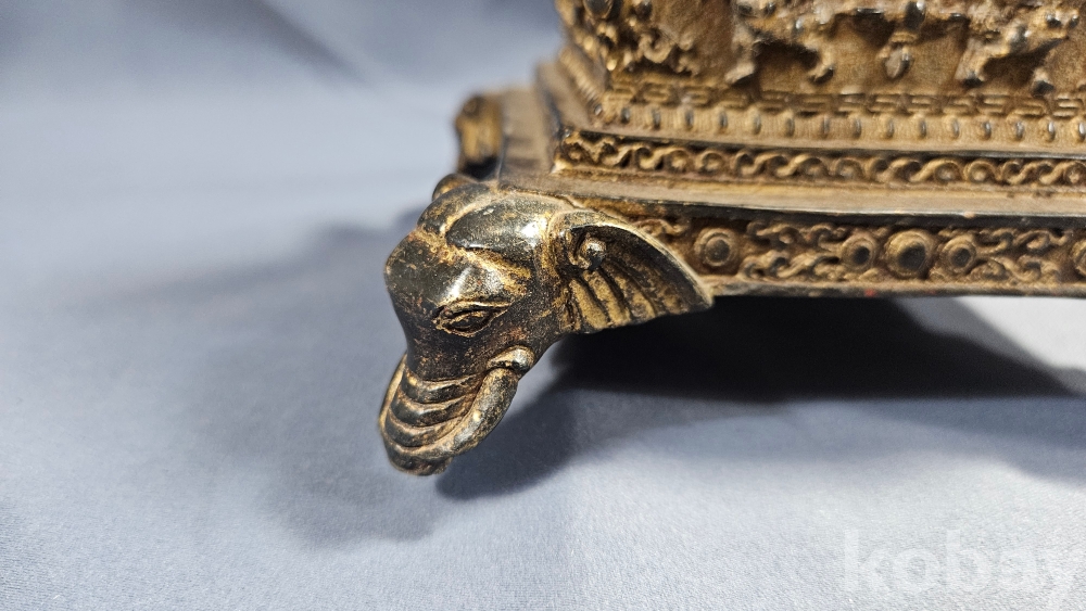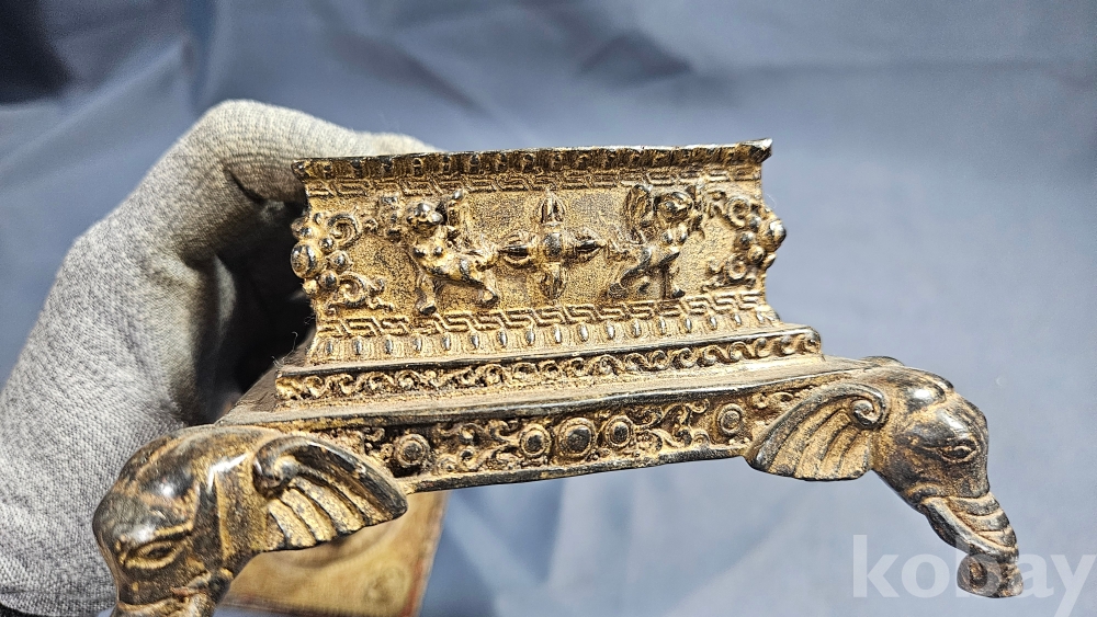 네 발이 코끼리 형태로 되어있는 고풍스러운 형태의 동 향로입니다.